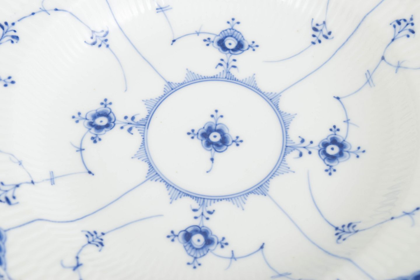 Royal Copenhagen blev grundlagt i 1775 i København under kongelig bevilling. Fabrikken er internationalt anerkendt for sit håndmalede porcelæn og sit høje kunstneriske niveau. Musselmalet Halvblonde er en variation af det klassiske Musselmalet stel og kombinerer riflede flader med en dekorativ blondekant, udført med stor håndværksmæssig præcision.