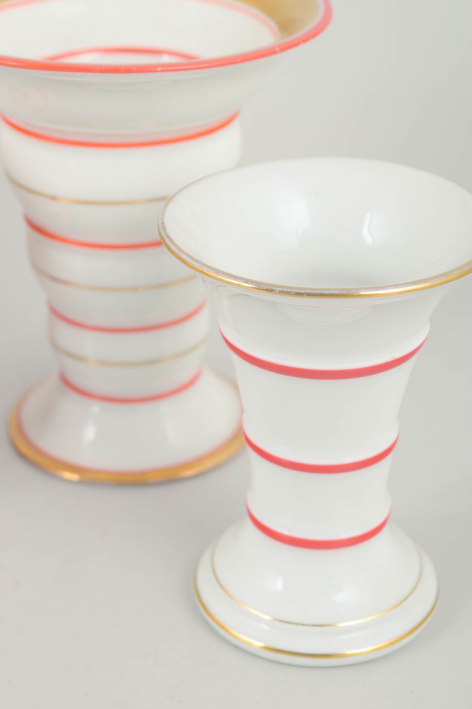 Tre små vaser i porcelæn med klassiske art deco former og dekoration i hvide nuancer med koralrøde stafferinger og guldkant. Vaserne fremstår med elegante proportioner og karakteristisk stil fra tysk porcelænsproduktion i mellemkrigstiden.