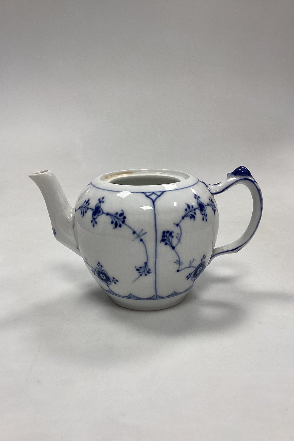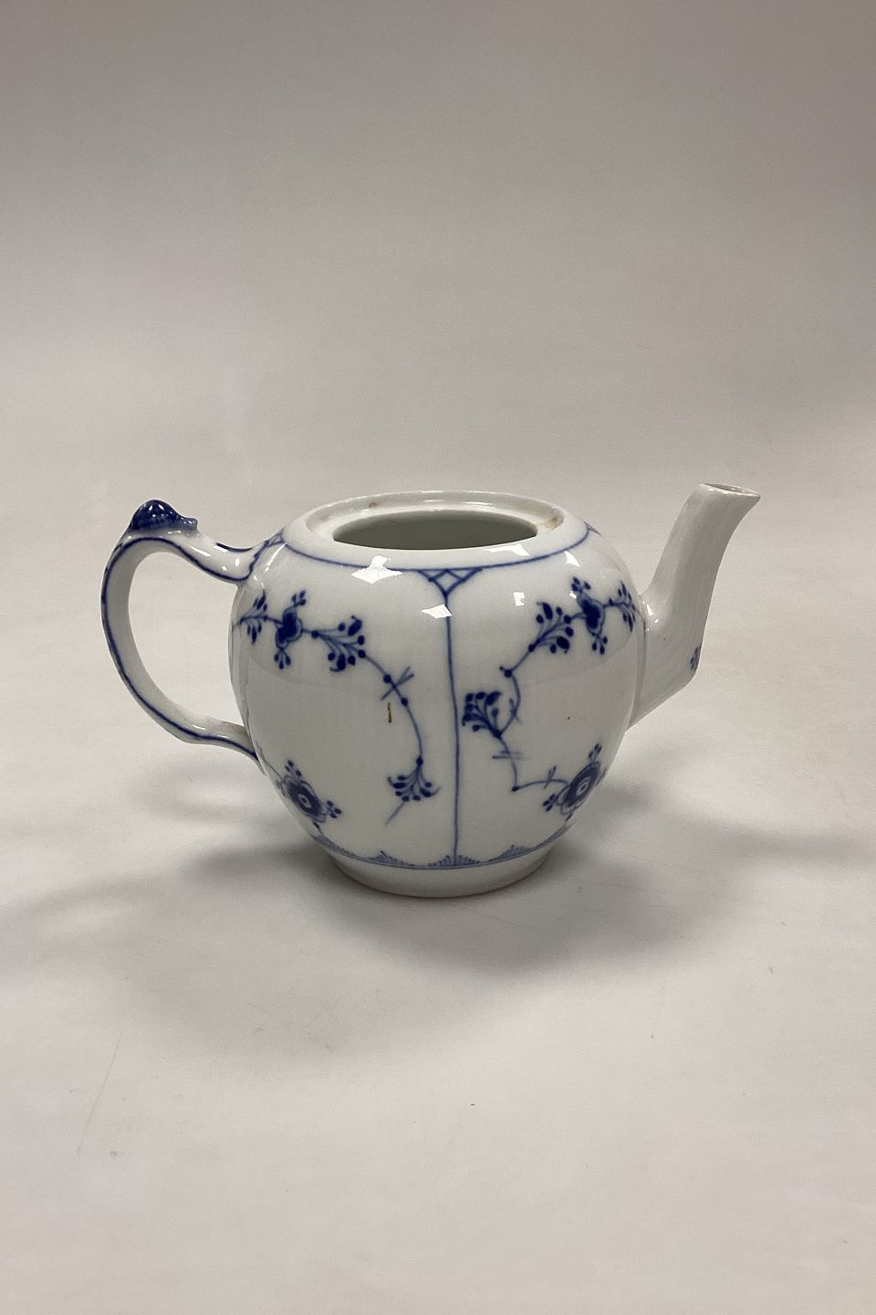 Royal Copenhagen Musselmalet Riflet Tekande, lille No. 258 uden låg. Måler 19,5 cm / 7,67 in. fra tud til hank. Højde 11 cm / 4,33 in. 2. Sortering med små brændingsfejl, se fotos.