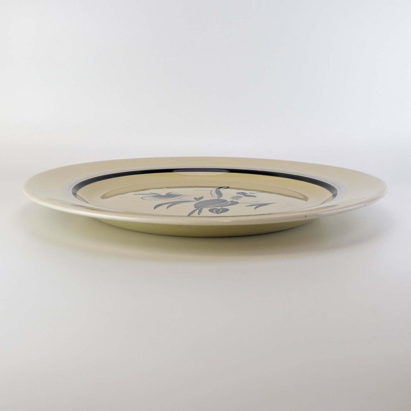 Rundt serveringsfad i fajance fra stellet Dragsholm fremstillet i perioden 1934-1965. Nr 256