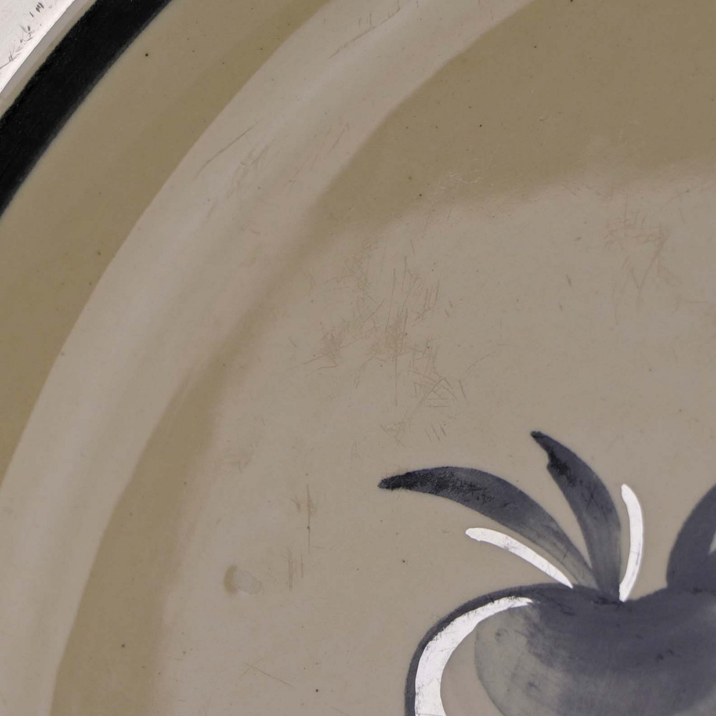 Fremstår med ridser i bunden af fadet, brugsspor på dekorationen samt en grøn plet under glasuren på fadets bagside og ujævnheder i glasuren.
