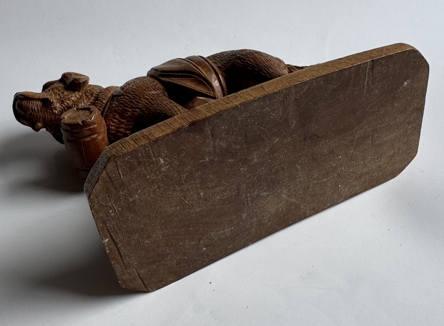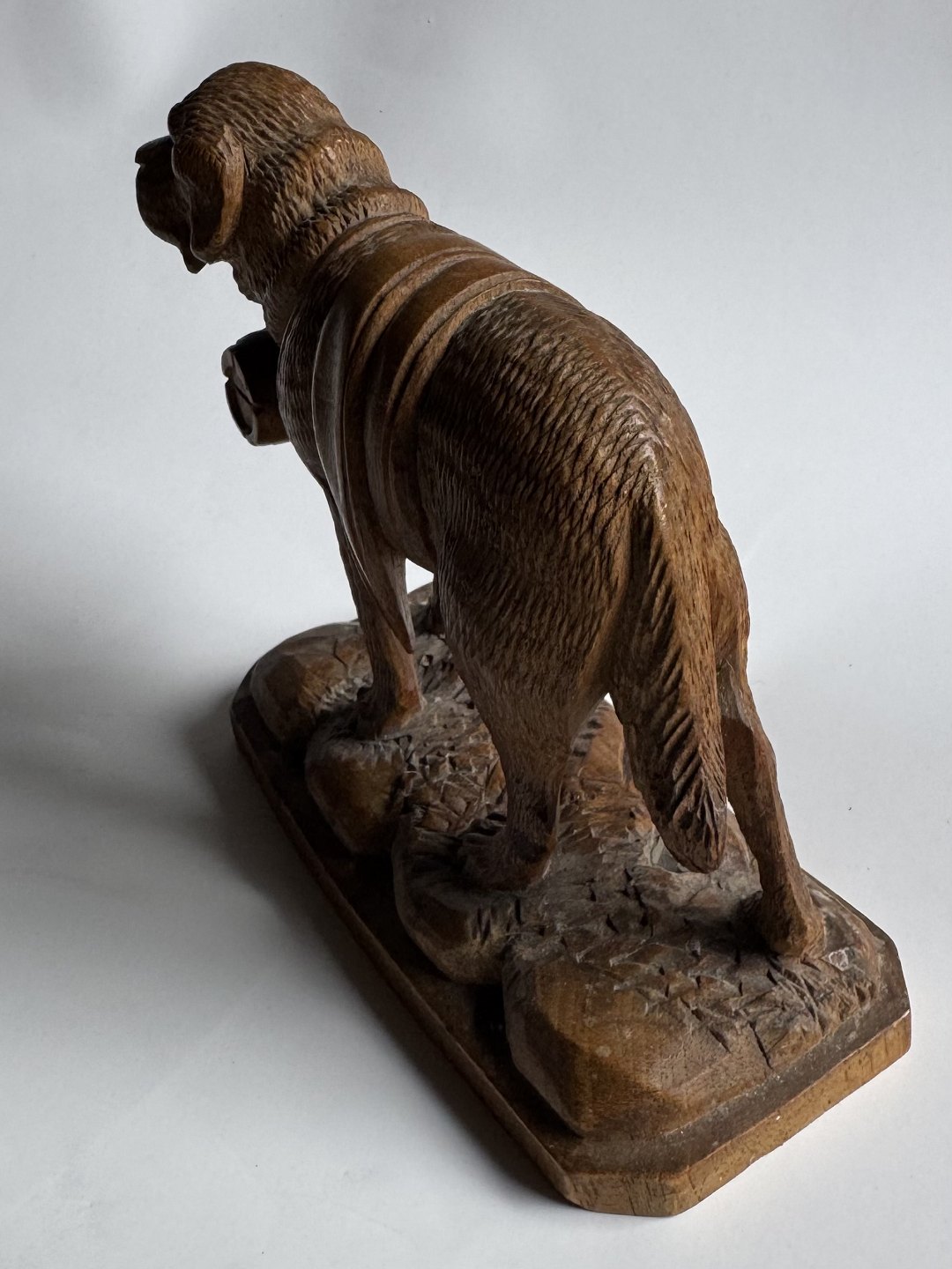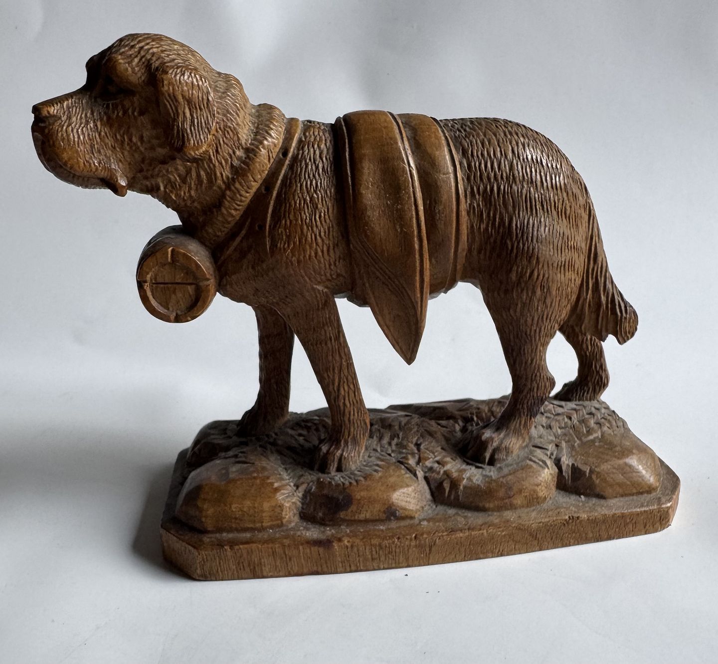 Udskåret figur i lindetræ forestillende en Sankt Bernard hund med den evige tønde i træ rundt om halsen. Fremstillet i Schweiz i begyndelsen af 20. århundrede. Fremstår i god stand uden skader eller reparationer. Mål: H. 12,5 cm. Basen måler 6,2 x 13,4 cm.