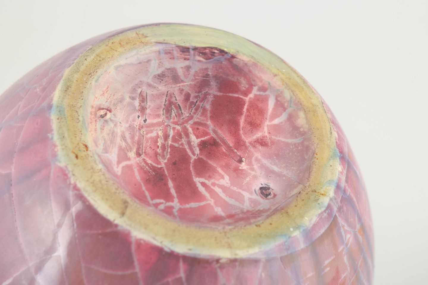 Imponerende balusterformet vase i stentøj med dyb rosa og violet lusterglasur samt dekorativ krakelering, udført i Kählers karakteristiske kunstneriske stil fra slutningen af 1800-tallet.
