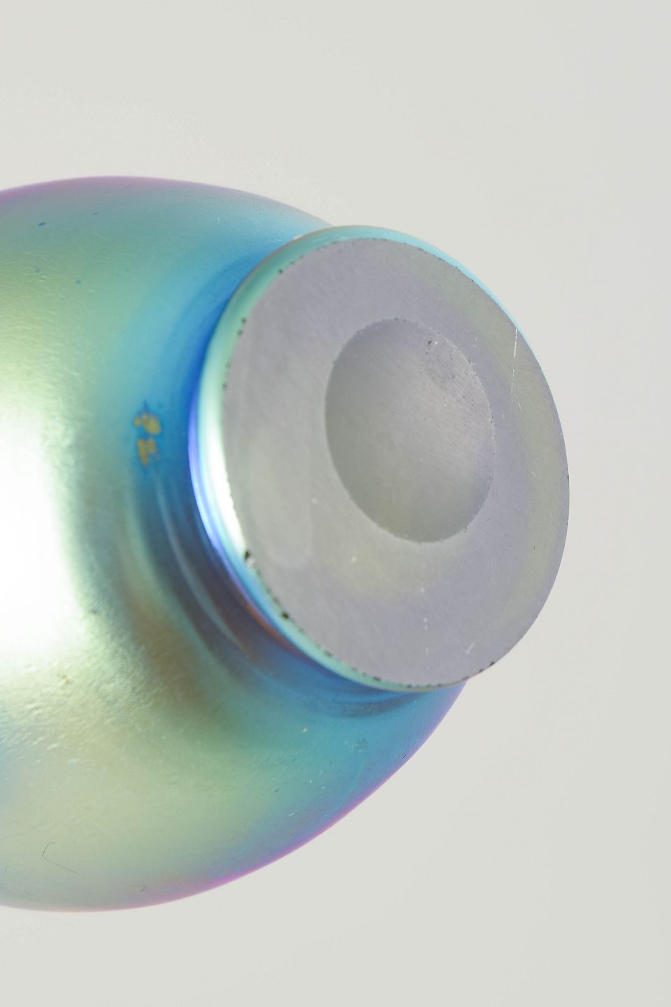 Elegant vase i mundblæst glas med silkemat iriserende overflade i blågrønne og gyldne nuancer med kobberfarvet skær ved mundingen. Den harmoniske, afrundede korpus med bred, udadbøjet krave og lille standring er karakteristisk for Loetz’ produktion i 1920’erne, hvor subtile farveovergange og metallisk glans blev kombineret med enkle, velafbalancerede former.