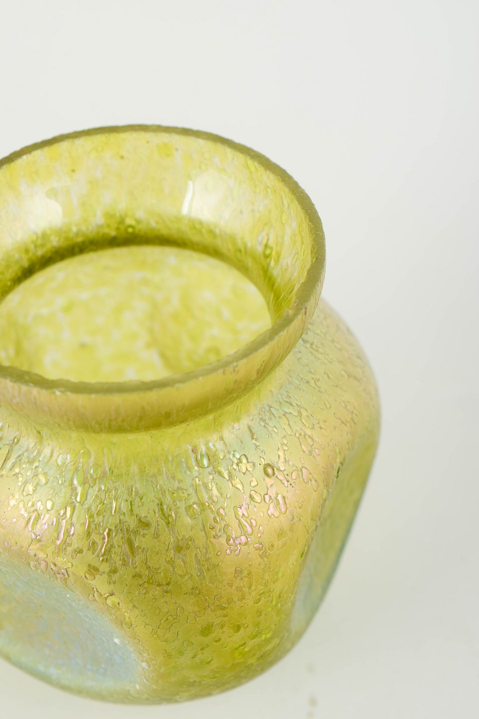 Kompakt vase i mundblæst glas med kraftig iriserende overflade i gulgrønne og blålige nuancer. Den rundede korpus med let udadbøjet hals og subtile, organiske strukturer i glasset er karakteristisk for Loetz’ mellemkrigsproduktion, hvor levende farvespil og metallisk glans var centrale virkemidler.