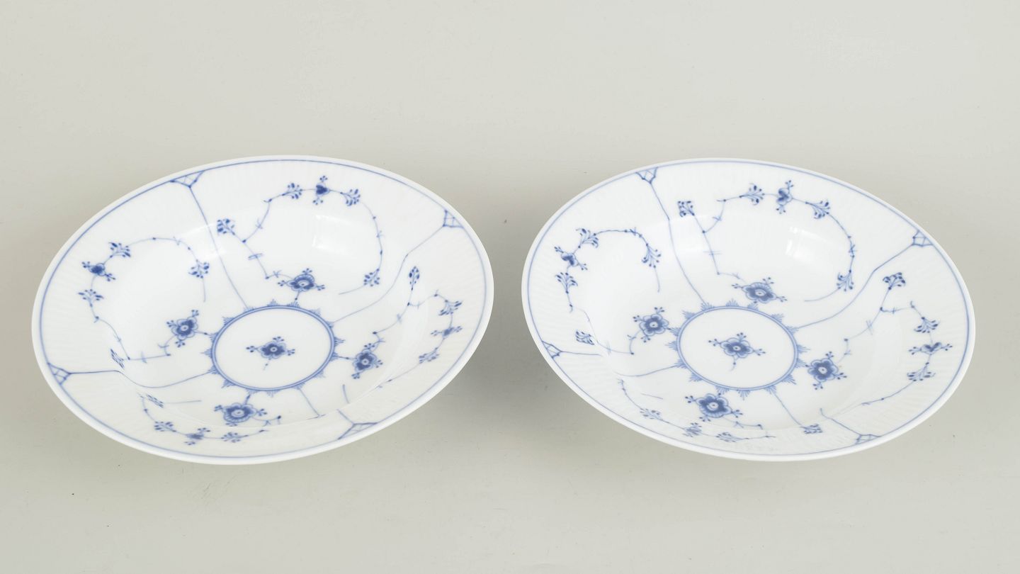 To håndmalede dybe tallerkener i Musselmalet Riflet dekoration, model 1/167, fra 1920’erne. Første sortering.