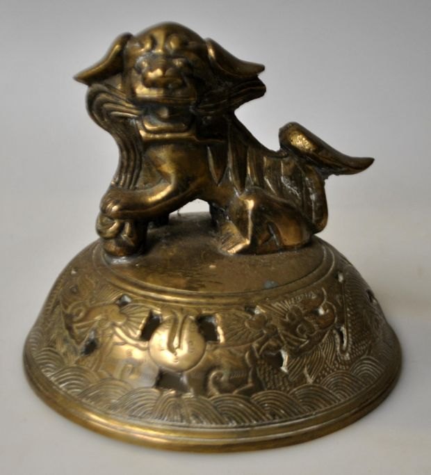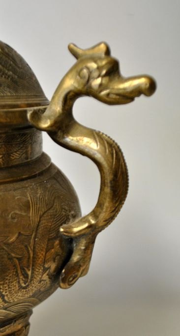 Kinesisk røgelseskrukke i bronze på tre ben, 19. årh. Med to ører; gennembrudt låg med dekoration i form af løve. På korpus dekoreret med drage og blomster. H.: 32 cm. B.: 25 cm. Stemplet.
