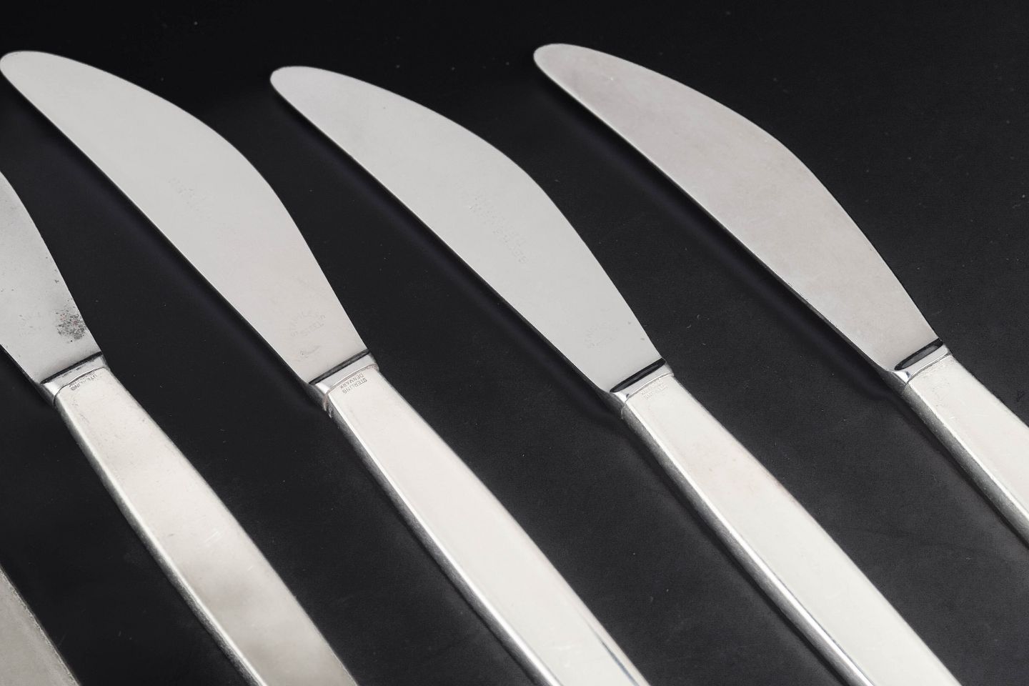 Sæt af seks frokostknive i rustfrit stål og sterlingsølv i modellen Cypress fra Georg Jensen. Bestikket er udført i et slankt og elegant formsprog med let konisk form og glatte, moderne linjer, karakteristisk for Georg Jensens efterkrigsdesign.