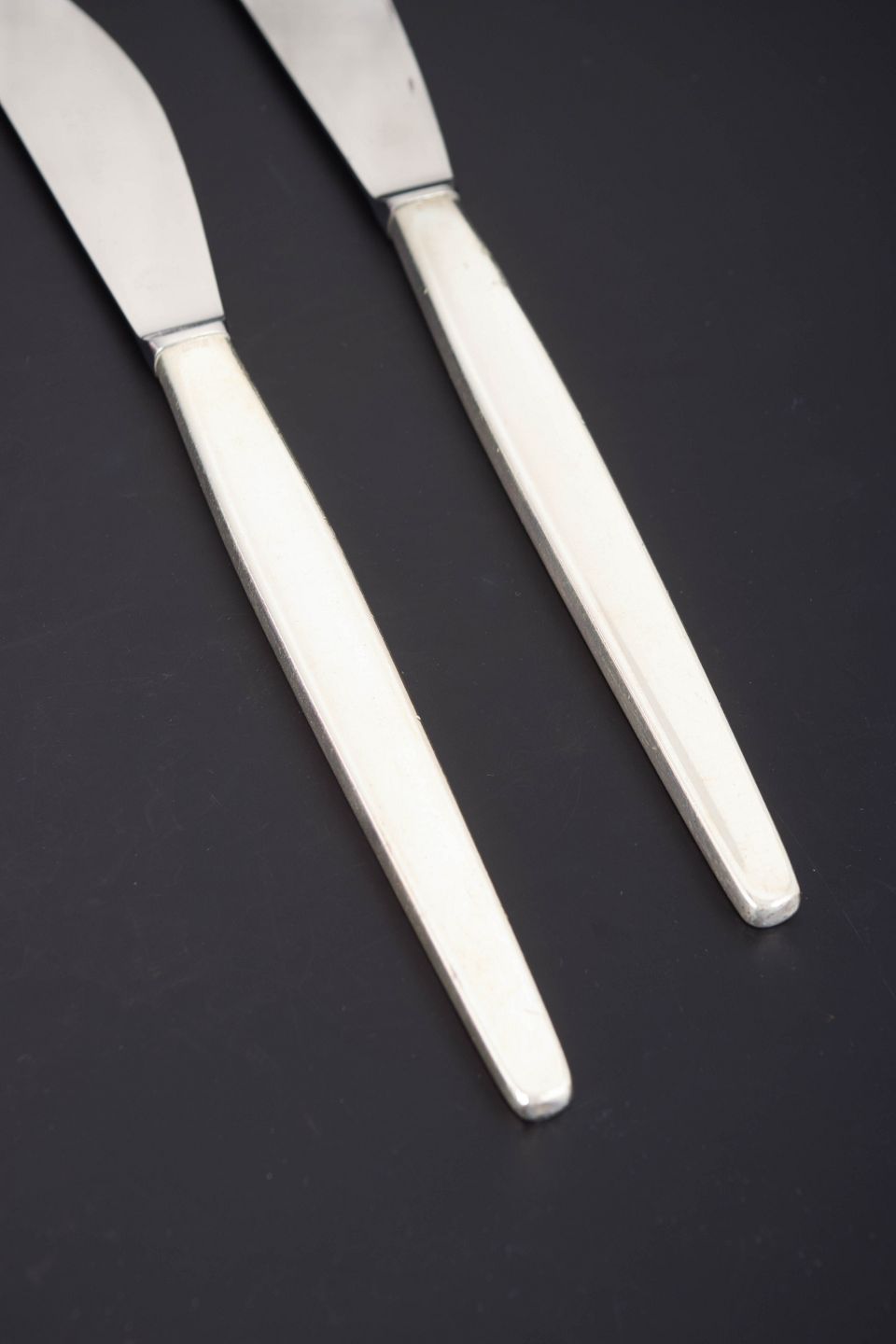 To frokostknive i rustfrit stål og sterlingsølv i modellen Cypres fra Georg Jensen. Bestikket er udført i et slankt og elegant formsprog med en let konisk form og glatte, moderne linjer, karakteristisk for Georg Jensens efterkrigsdesign.