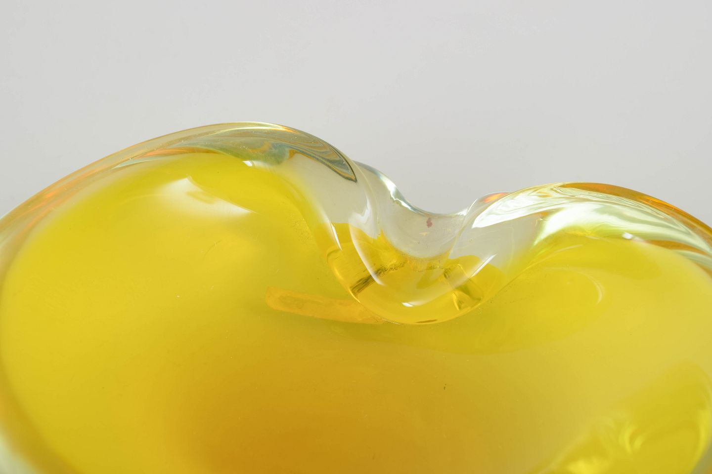 Organisk formet kunstglasskål i gult glas med klar rand og blødt bølgende form. Original mærkat “Murano Glass – Made in Italy”.