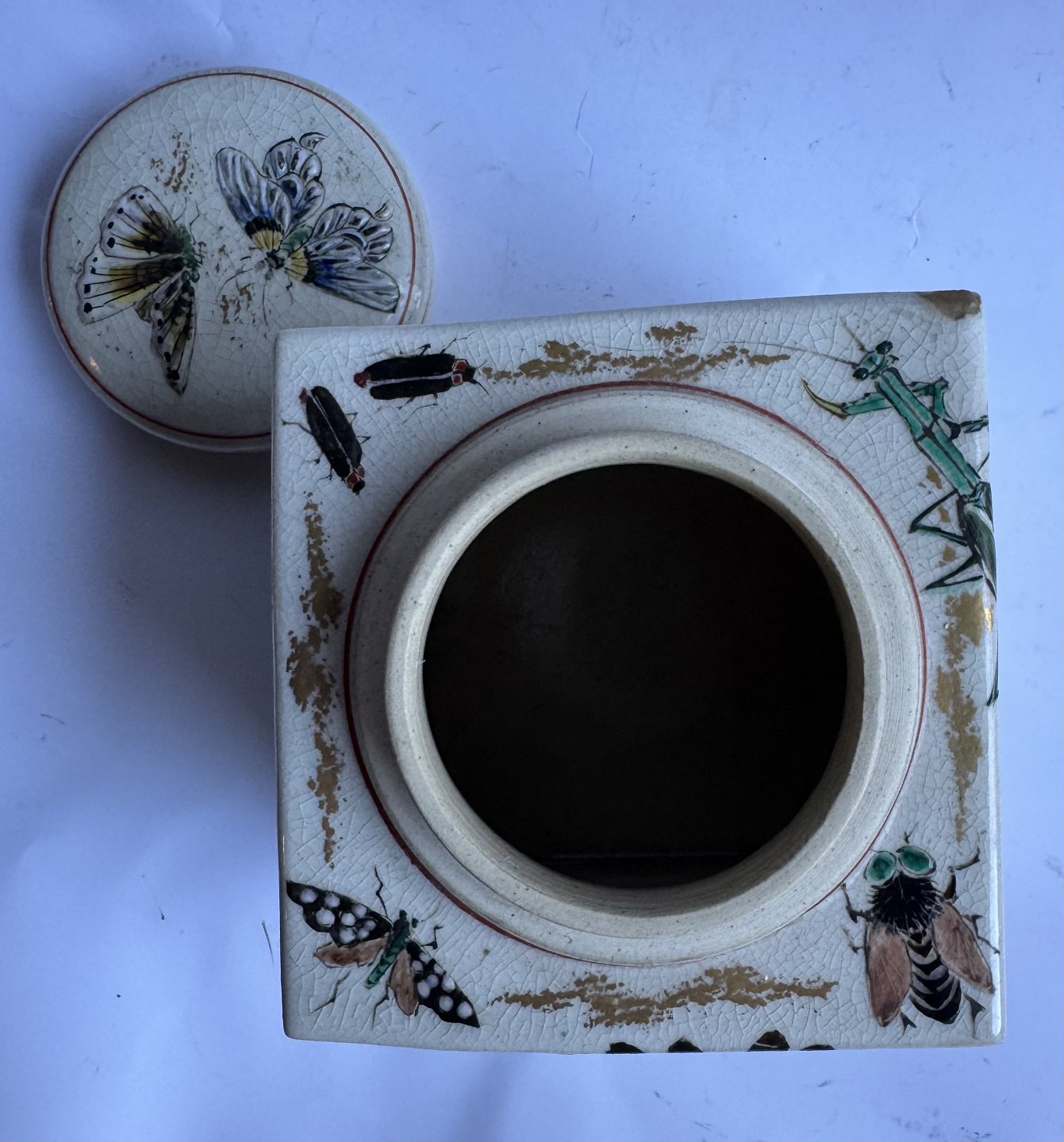 Firkantet tedåse i fajance fra Japan produceret omkring 1910. Smukt dekoreret med insekter i emalje, bl.a. sommerfugle og guldsmed, på alle sider samt på låget. Ubekendt fabriksmærke indstemplet på bunden. Ud over et lille skrab på et hjørne (følg de grå pile) er der intet at bemærke. Mål: H. 10,7 cm samt 9,5 x 9,5 cm.