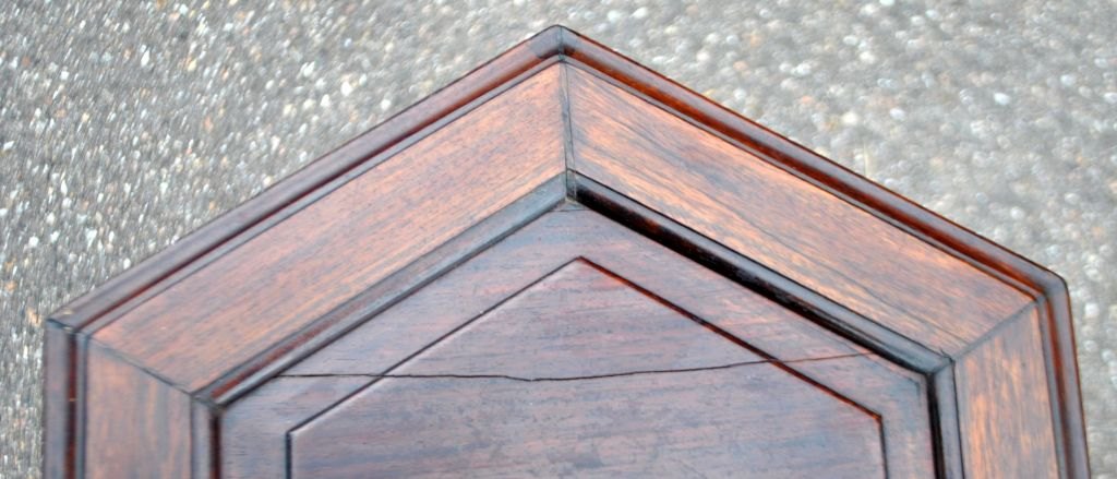 Sekskantet sidebord, 19. årh. Kina. Mahogni. På tre ben med udskæringer. H: 58,5 cm. B: 39 cm.