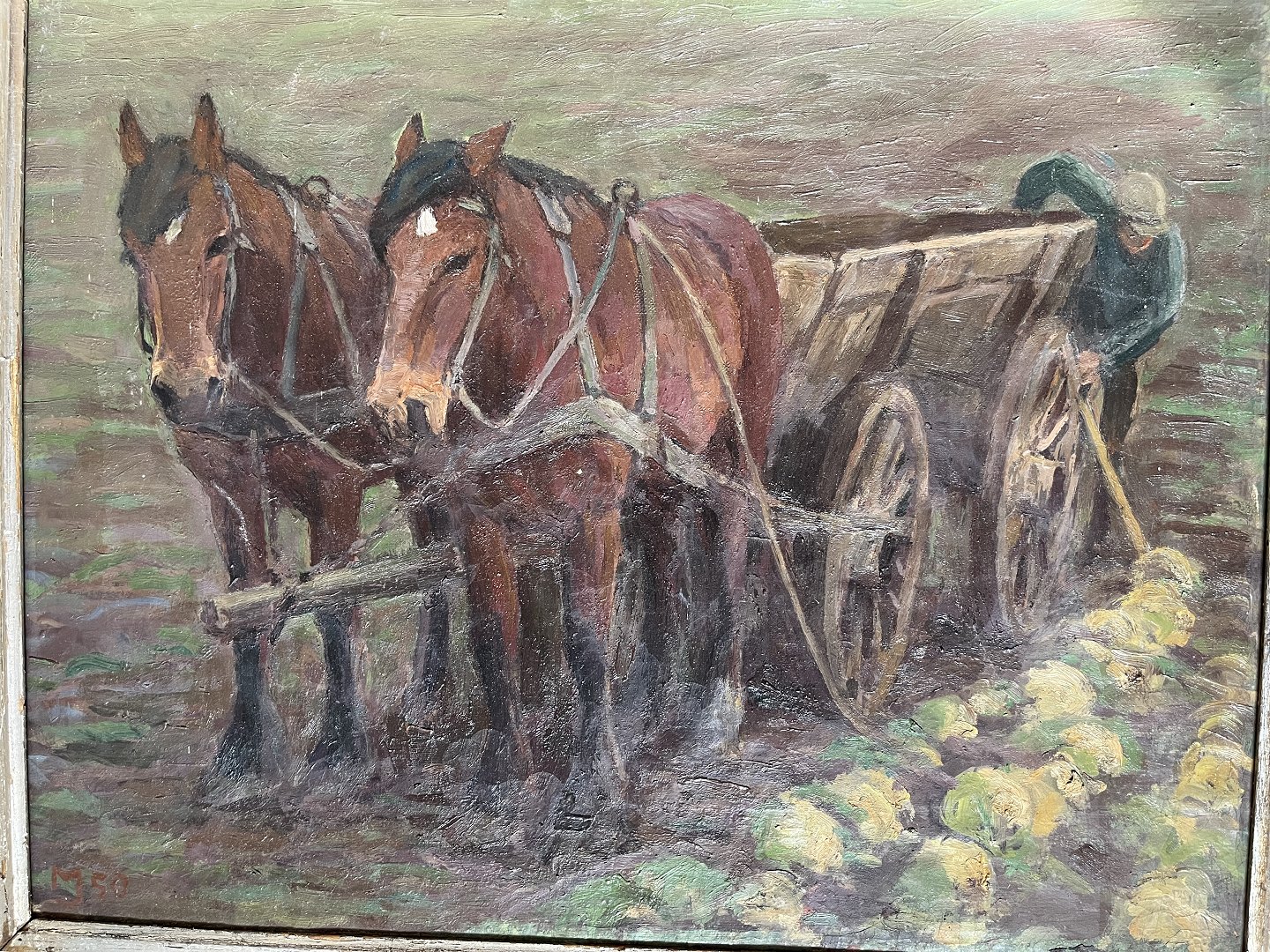 Maleri af Marius Jensen Hindevad - Kål høsten bringes i hus 1950