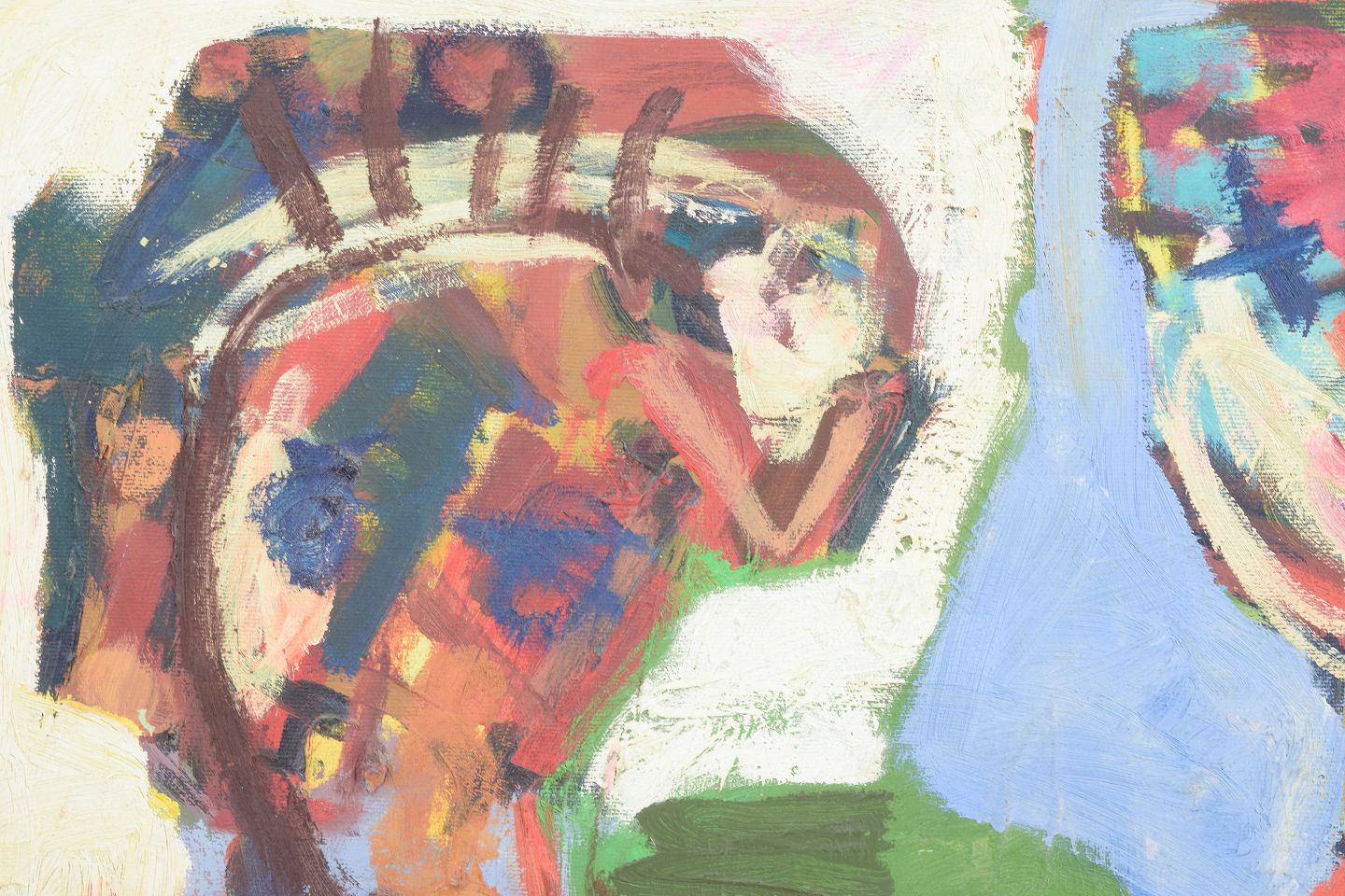 Farverigt og spontant komponeret motiv udført i en fri, ekspressionistisk stil med kraftige penselstrøg og figurative antydninger, inspireret af Cobra-bevægelsens legende og intuitive billedsprog.