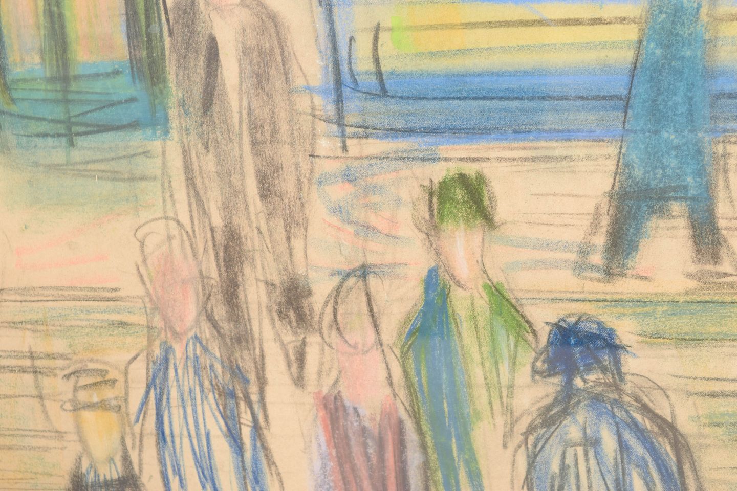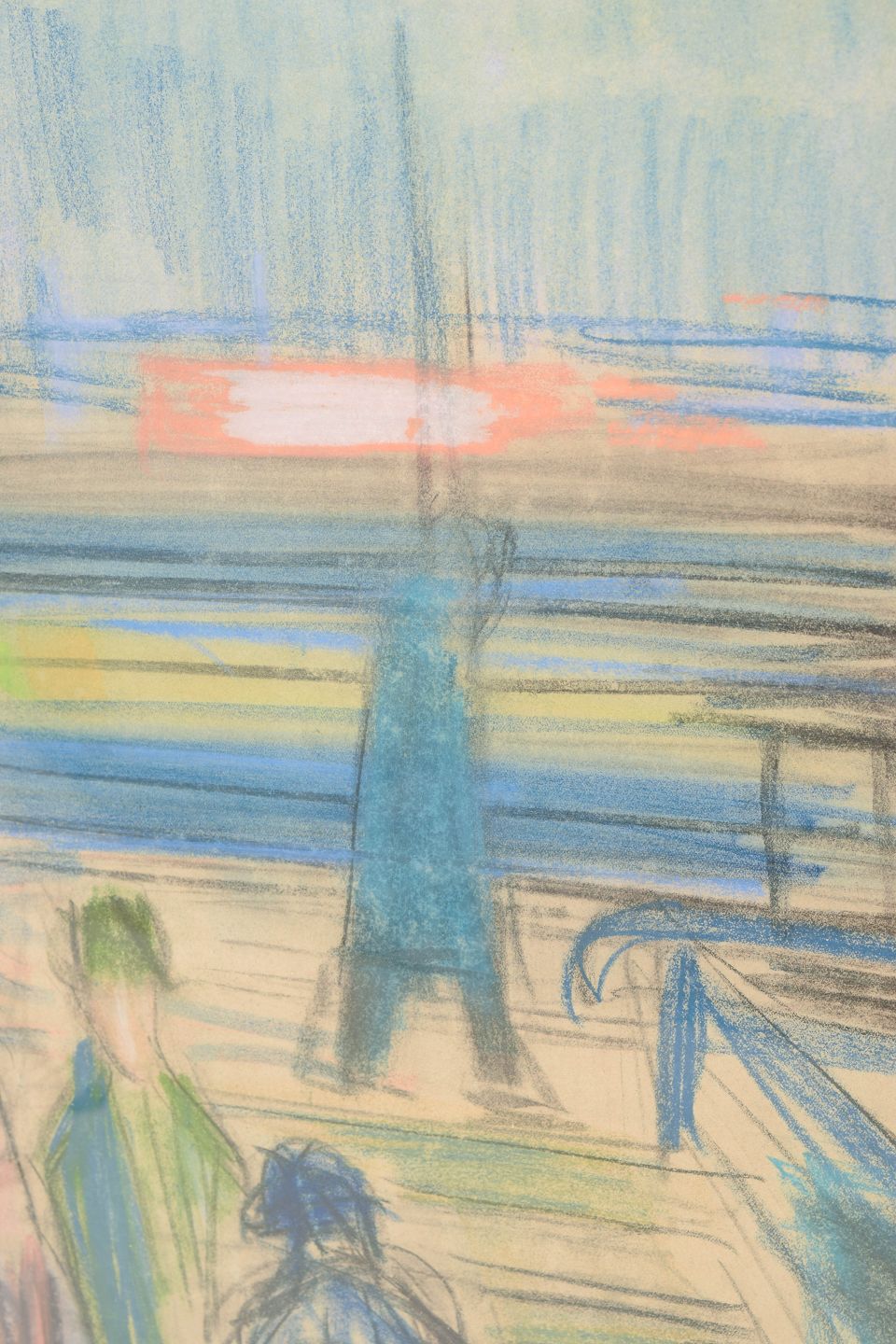 Ekspressivt motiv med figurer og arkitektoniske elementer udført i farvekridt på papir, signeret B. Klercker nederst til højre. Kompositionen viser en stiliseret byscene med mennesker og konstruktioner gengivet i et frit, modernistisk formsprog og en let, atmosfærisk farveholdning.