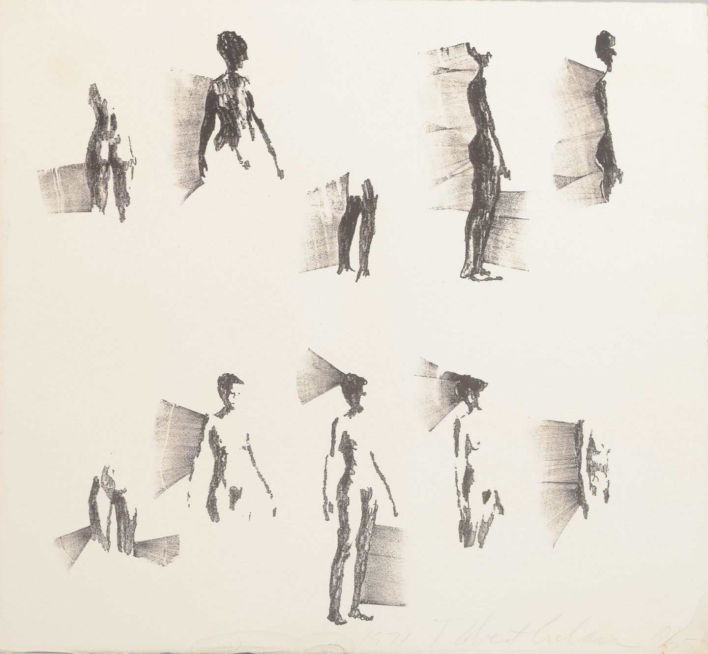 Grafisk komposition med studier af stående nøgne figurer udført som litografi, signeret med blyant, dateret 1971 og nummereret 10/55.