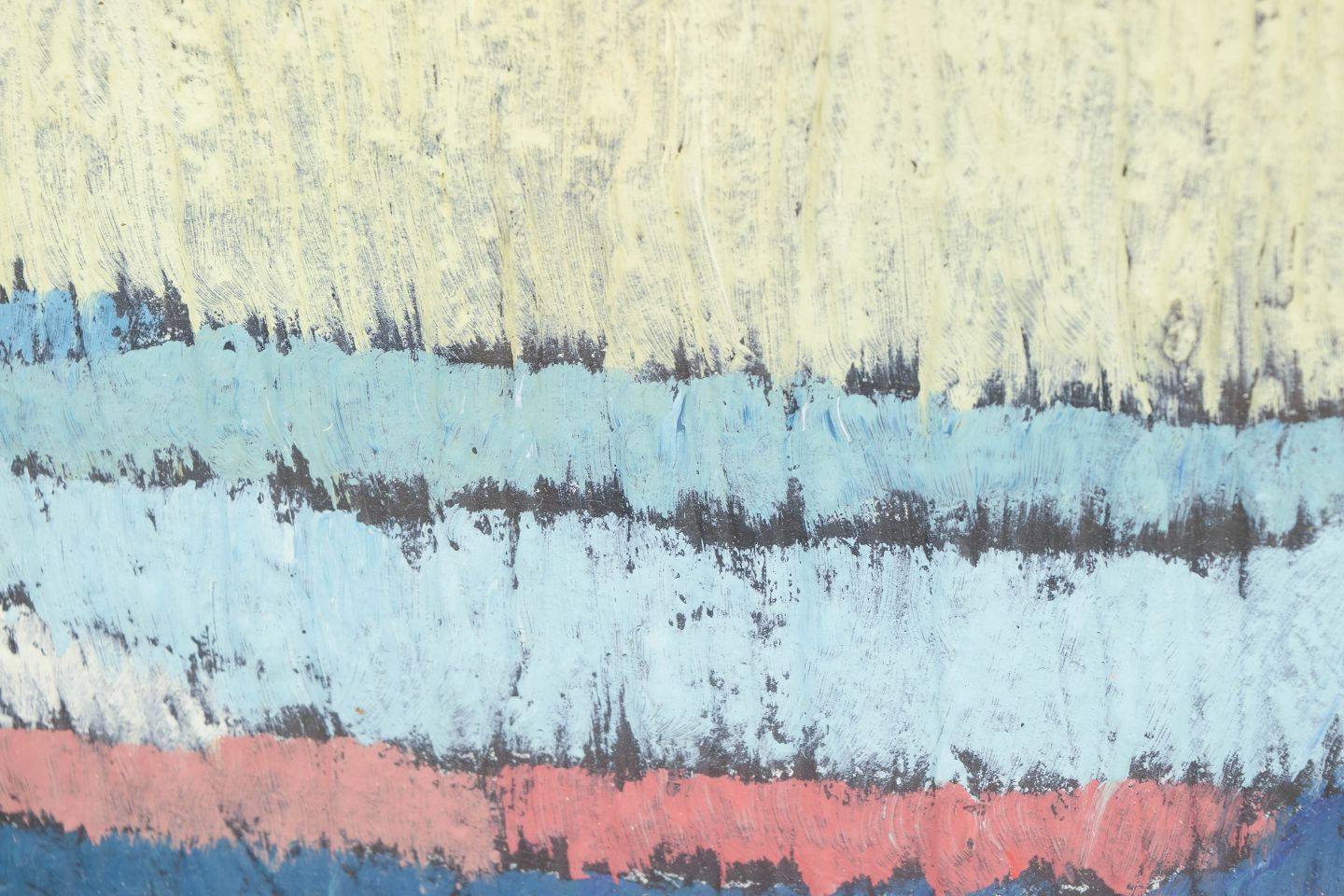 Abstrakt landskabskomposition udført i olie på papir med brede, strukturerede penselstrøg i blå, hvide og grønne toner med et horisontalt bånd i rødligt nuance. Kompositionen har en tydelig horisontal opbygning, der giver associationer til hav og kystlandskab.
