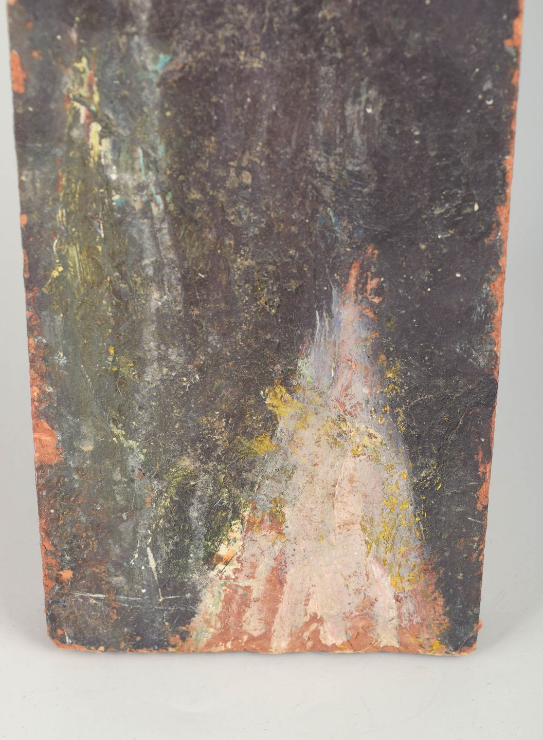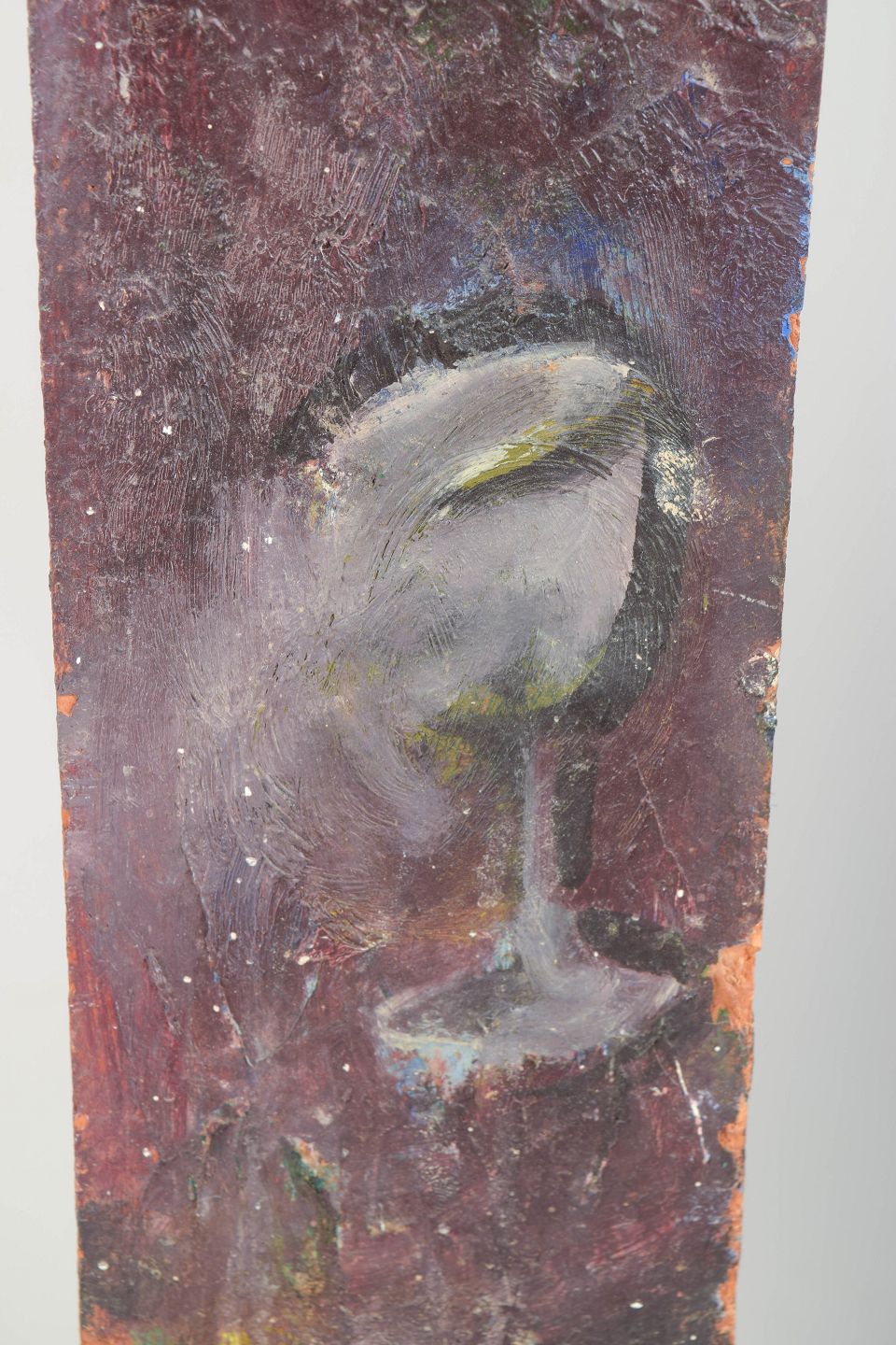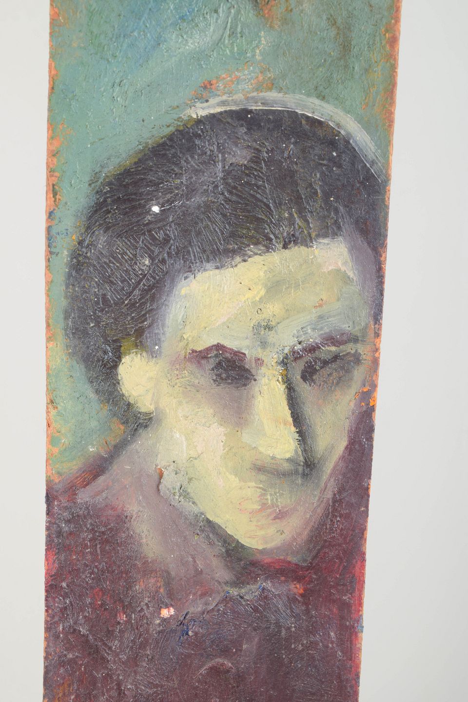 Smalt, vertikalt figurativt motiv udført i olie på træplade. Kompositionen viser en stiliseret menneskefigur i afdæmpede grønne, røde og grå toner med en drømmende og let ekspressiv karakter. Den aflange form giver værket et næsten ikonagtigt udtryk, hvor figuren fremstår centralt placeret i en enkel, malerisk baggrund.