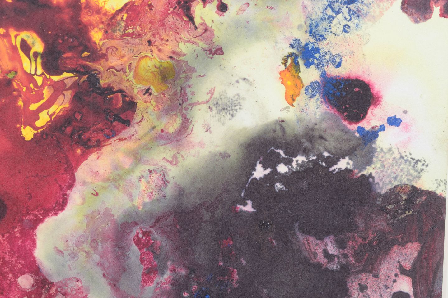 Abstrakt komposition udført som farvetryk med dynamiske farvefelter i intense røde, gule, blå og mørke toner. Motivet har en flydende og eksplosiv karakter med organiske former og transparente lag. Signeret i blyant, dateret 2022.