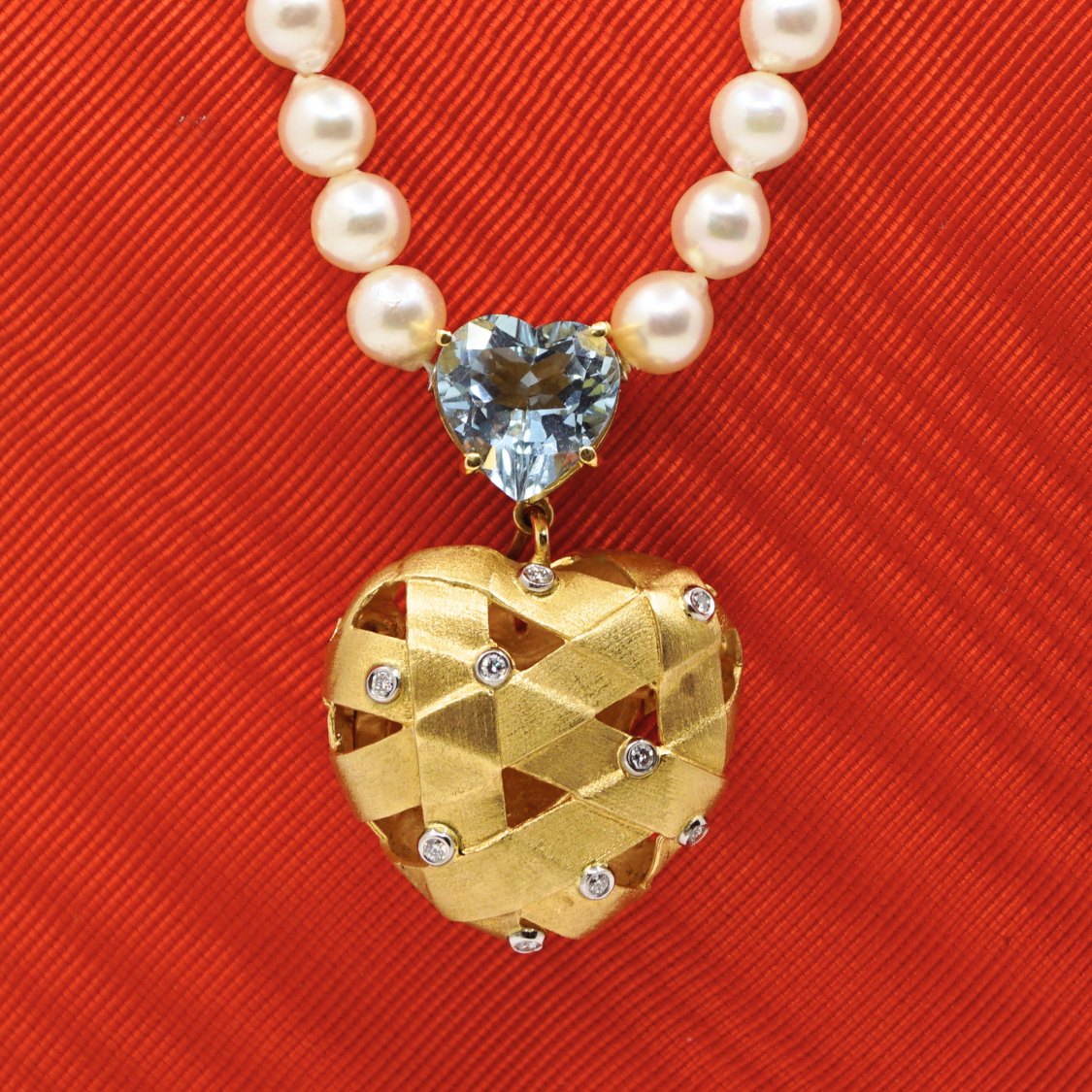 Ole Lynggaard; Smykkelås sammensat af to hjertelåse. Flettet hjertelås i 14 kt. guld med 9 diamanter. Samt hjertelås i 18 kt. guld med lyseblå sten.