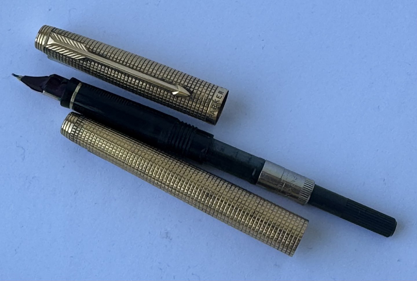 Parker 75 Cicelé fyldepen med ternet mønster på overflade i guld-double. Fremstillet i U.S.A. i 1970’erne. Fuldt funktionsduelig. Fin overflade uden stød eller andre overflade brugsspor. Har dog brug for at blive pudset. For enden en 14 karat 585 guldspids fremstillet i Frankrig. L. 13 cm.