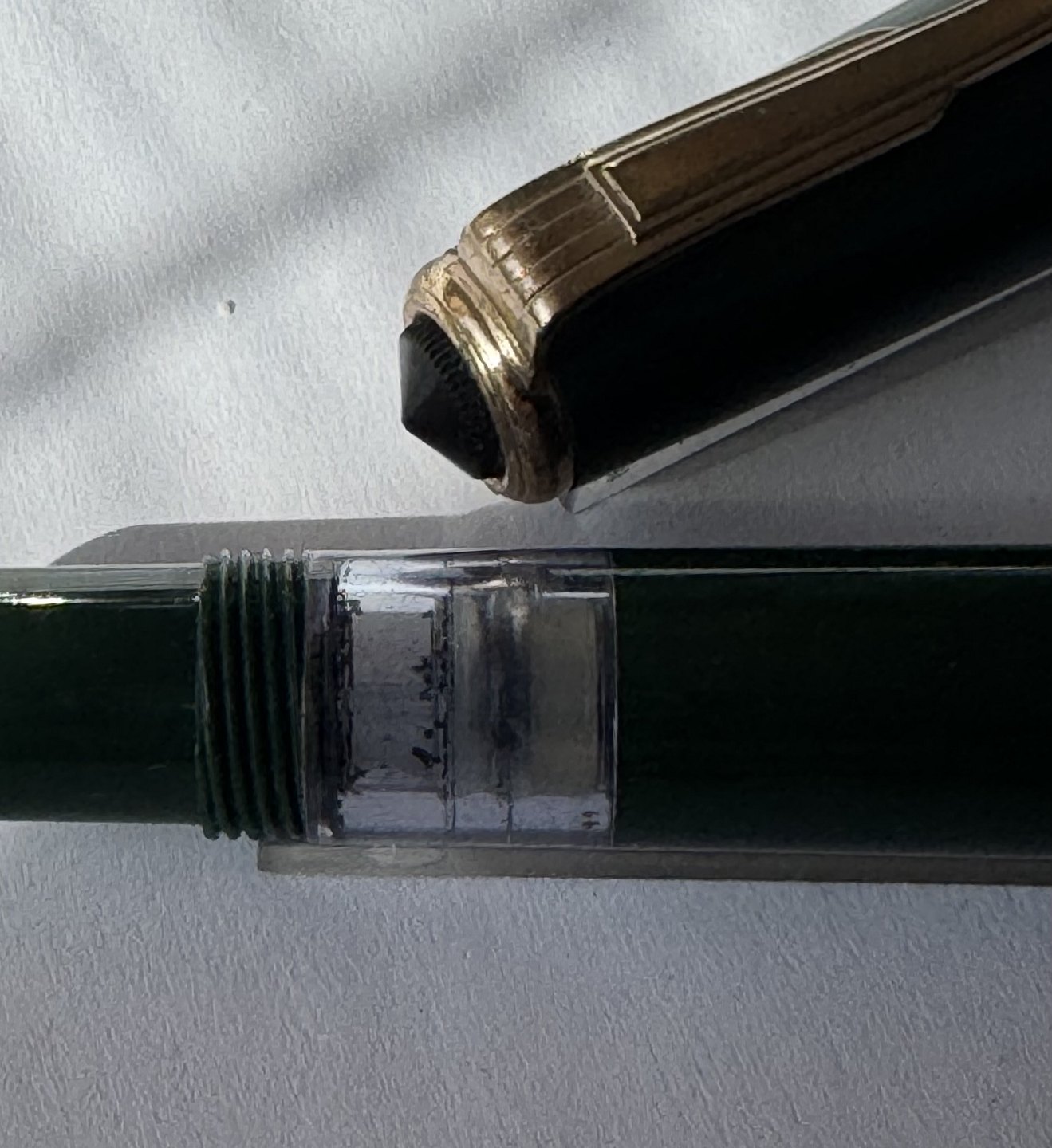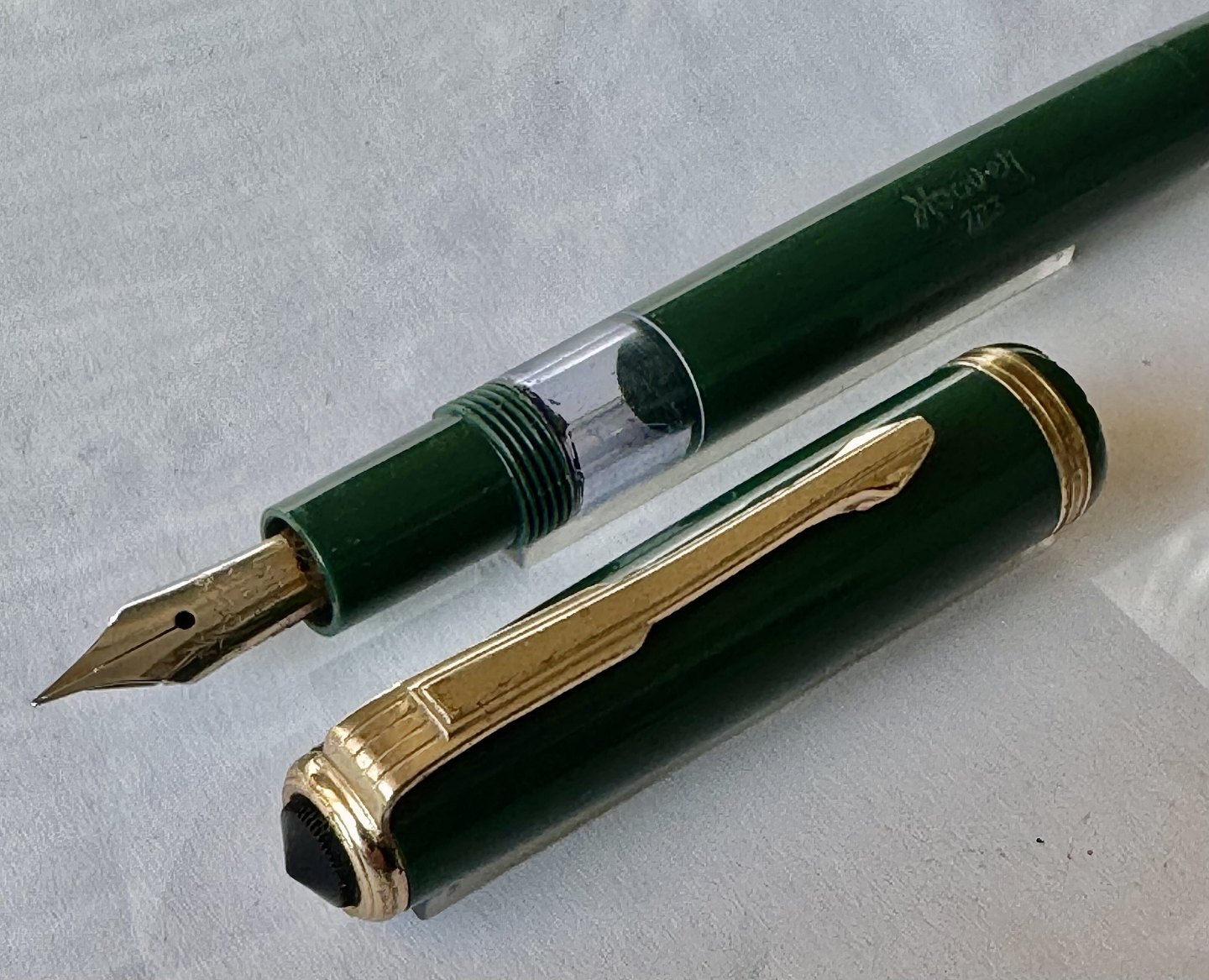 En vintage fyldepen klar til at blive brugt: Grøn Hoover nr. 783 fyldepen med piston filler blæk-påfyldningssystem. Alle dele originale. Nærmest ubrugt. Længde 12,5 cm.