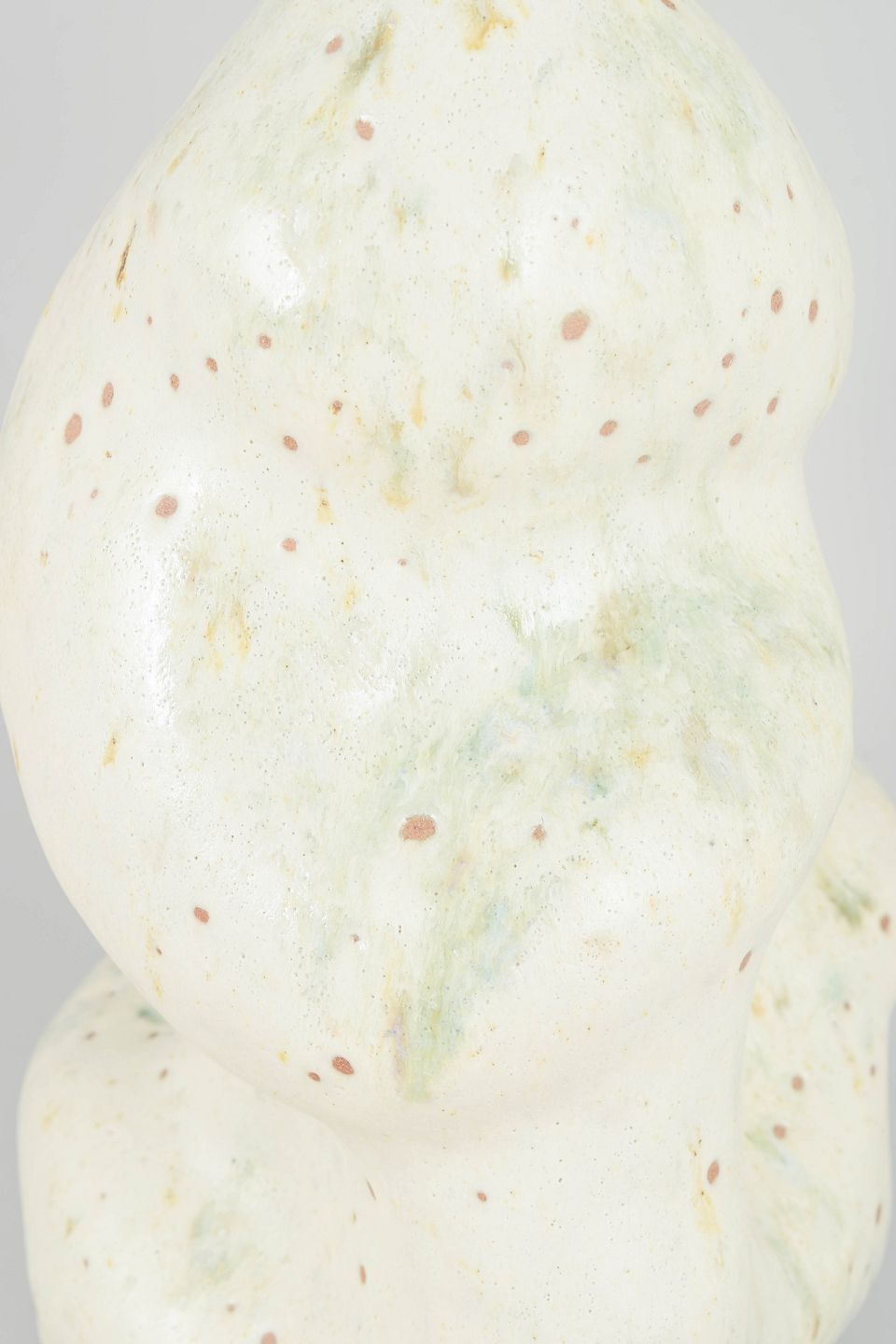 Unika stentøjsvase, organisk formet. Det varme brune stentøjsler er dækket af et lag cremefarvet glasur med grønlig tone og masser af pletter uden glasur der viser lerets varme tone.