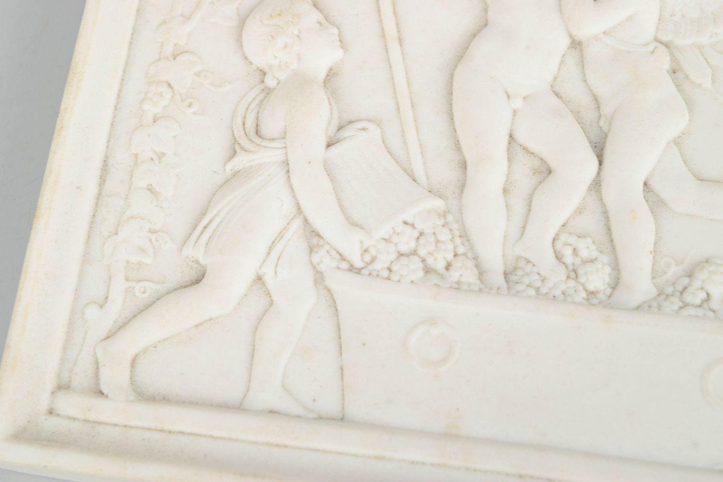 Rektangulært vægrelief i hvidt bisquitporcelæn med klassicistisk motiv af putti i figurkomposition efter Bertel Thorvaldsen, udført med fine detaljer og blød modellering i nyklassicistisk stil.