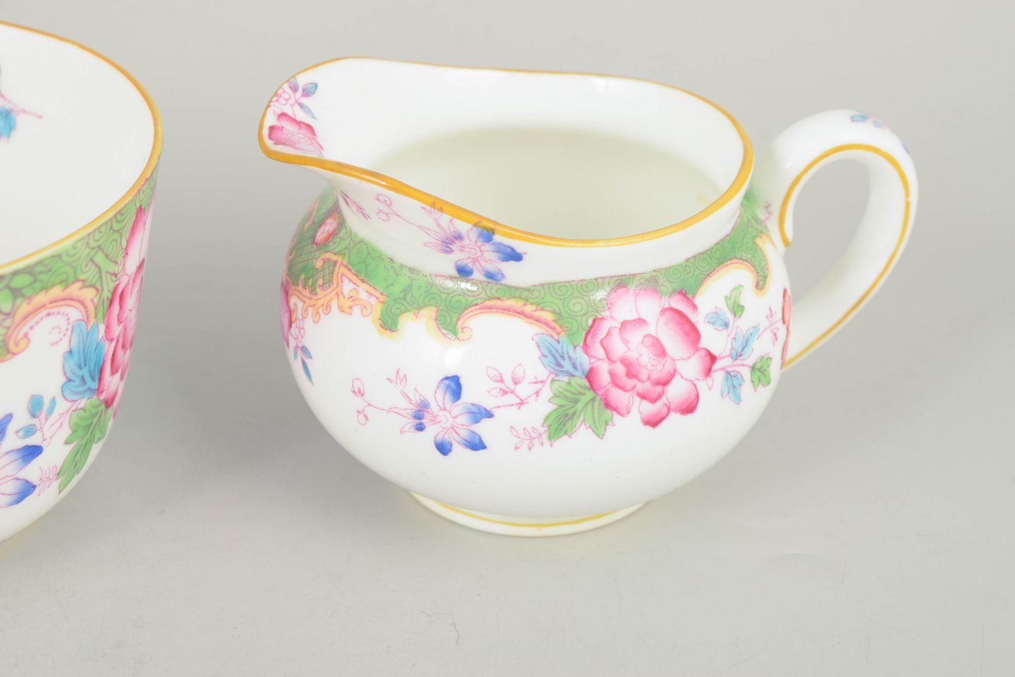 Dekorativt sæt i porcelæn bestående af flødekande og sukkerskål med farverig blomsterdekoration i Temple mønster og karakteristisk grøn bort.