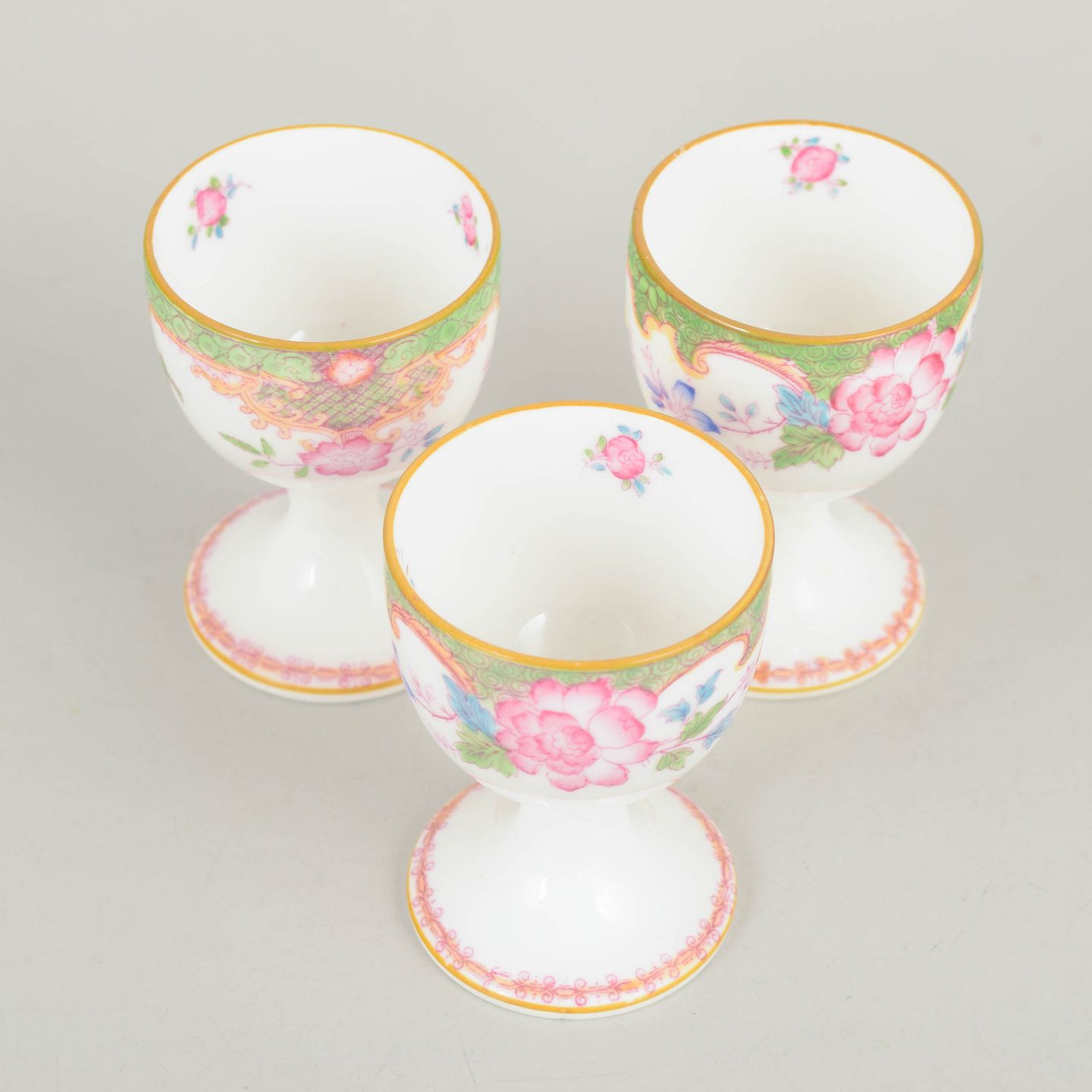 Dekorative æggebægre i porcelæn med farverig blomsterdekoration i Temple mønster og karakteristisk grøn bort.