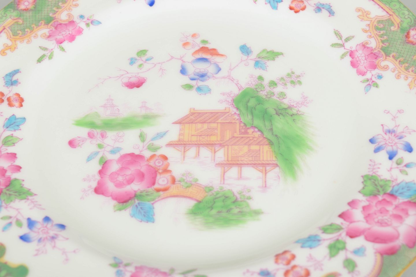 Dekorative tallerkener i porcelæn med farverig blomster- og landskabsdekoration i Temple mønster, med centrale orientalske motiver og grøn bort.