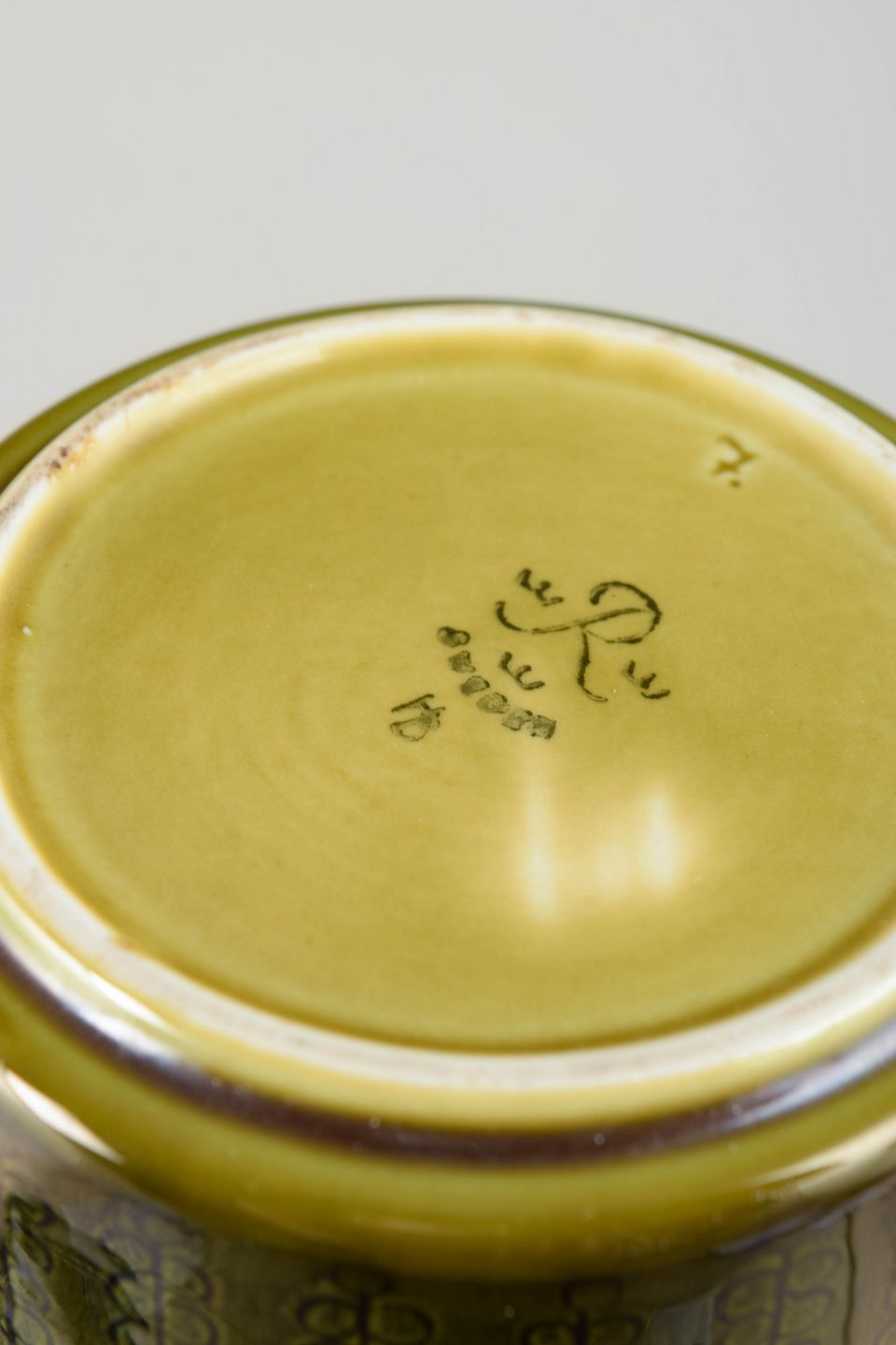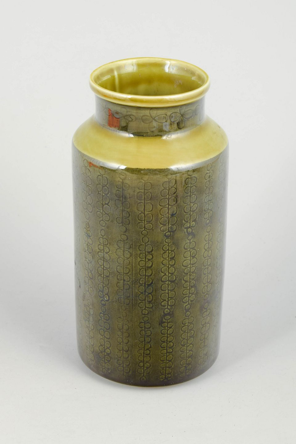 Cylindrisk stentøjsvase med slank form og let udadbøjet hals. Dekoreret med grafisk mønster i dæmpede toner under blank glasur med gul nuance ved randen, karakteristisk for Rörstrands produktion i midten af det 20. århundrede.