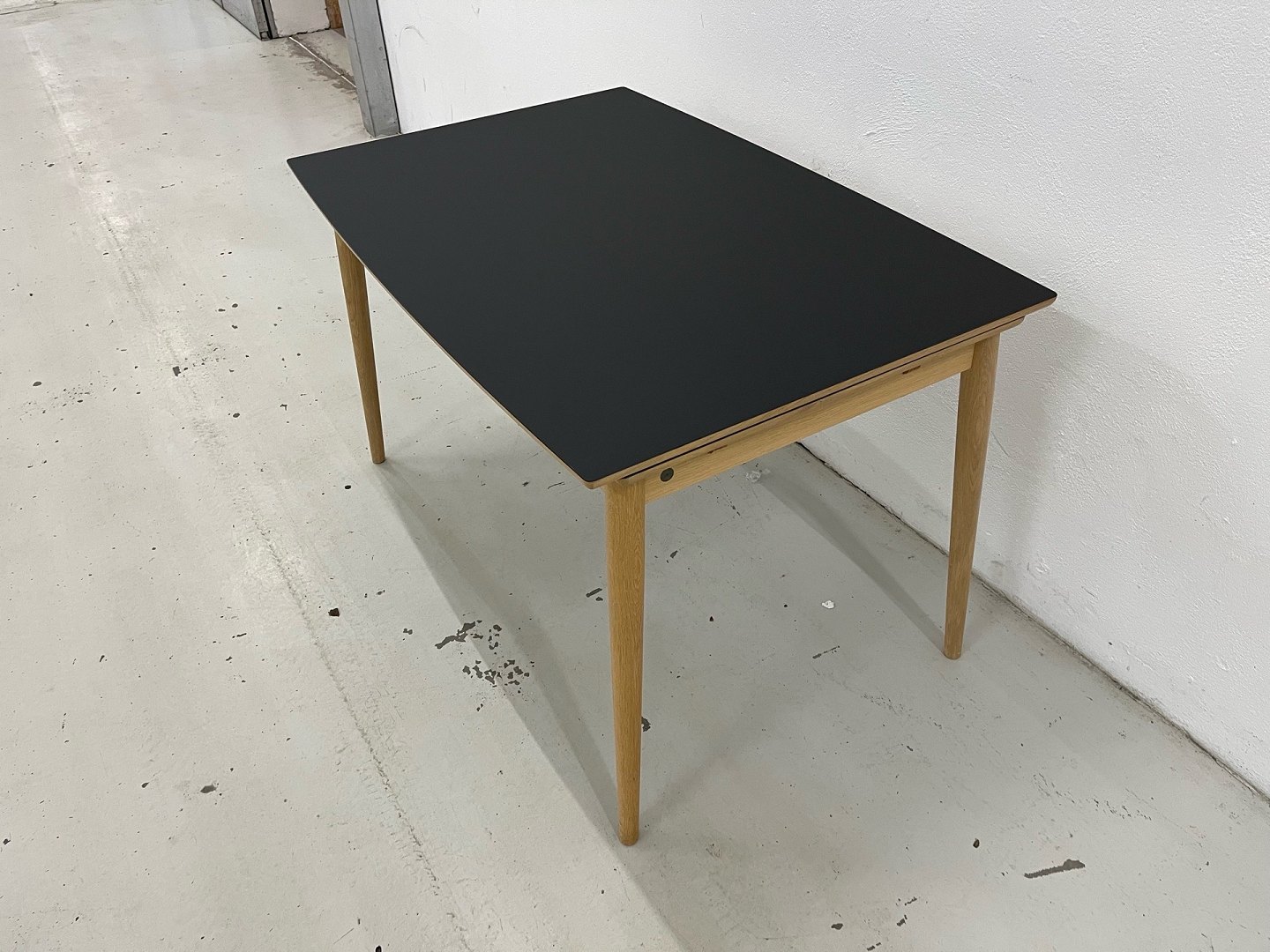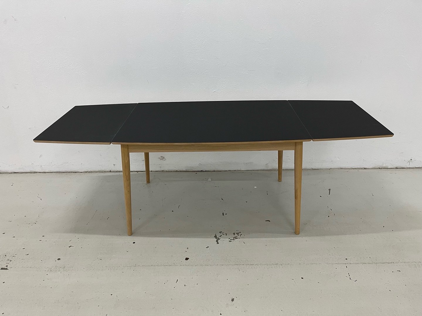 Curve spisebord fra Pbj Design med 2 x hollandsk udtræk. Bordplade i sort linoleum samt stel og ben i sæbebehandlet egetræ.