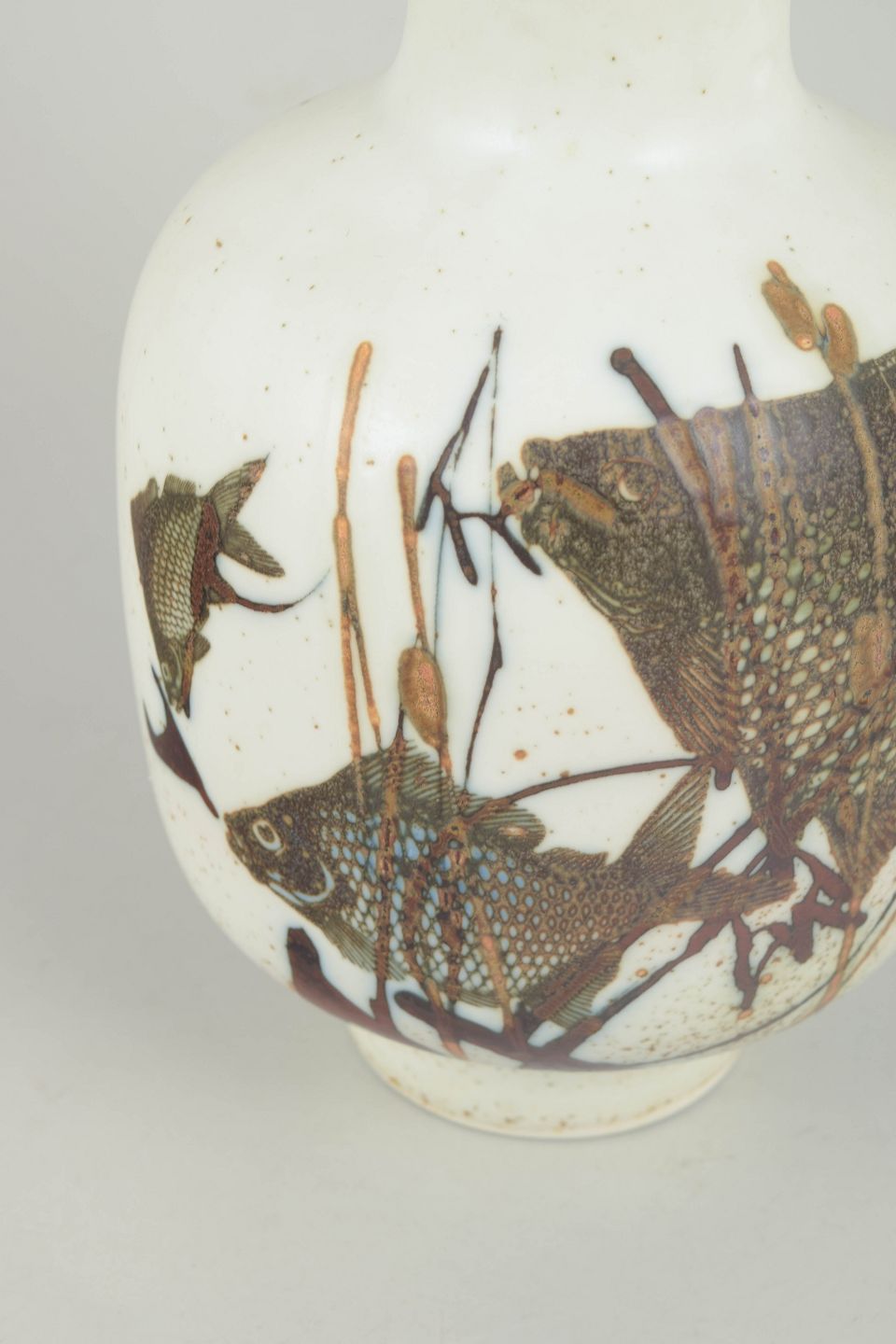 Stor vase i stentøj dekoreret med stiliseret havbundsmotiv med fisk og vegetation i dæmpede brunlige, blå og grønne nuancer. Modellenummer 1064 / 5363. Første sortering med original fabriksmærkat.