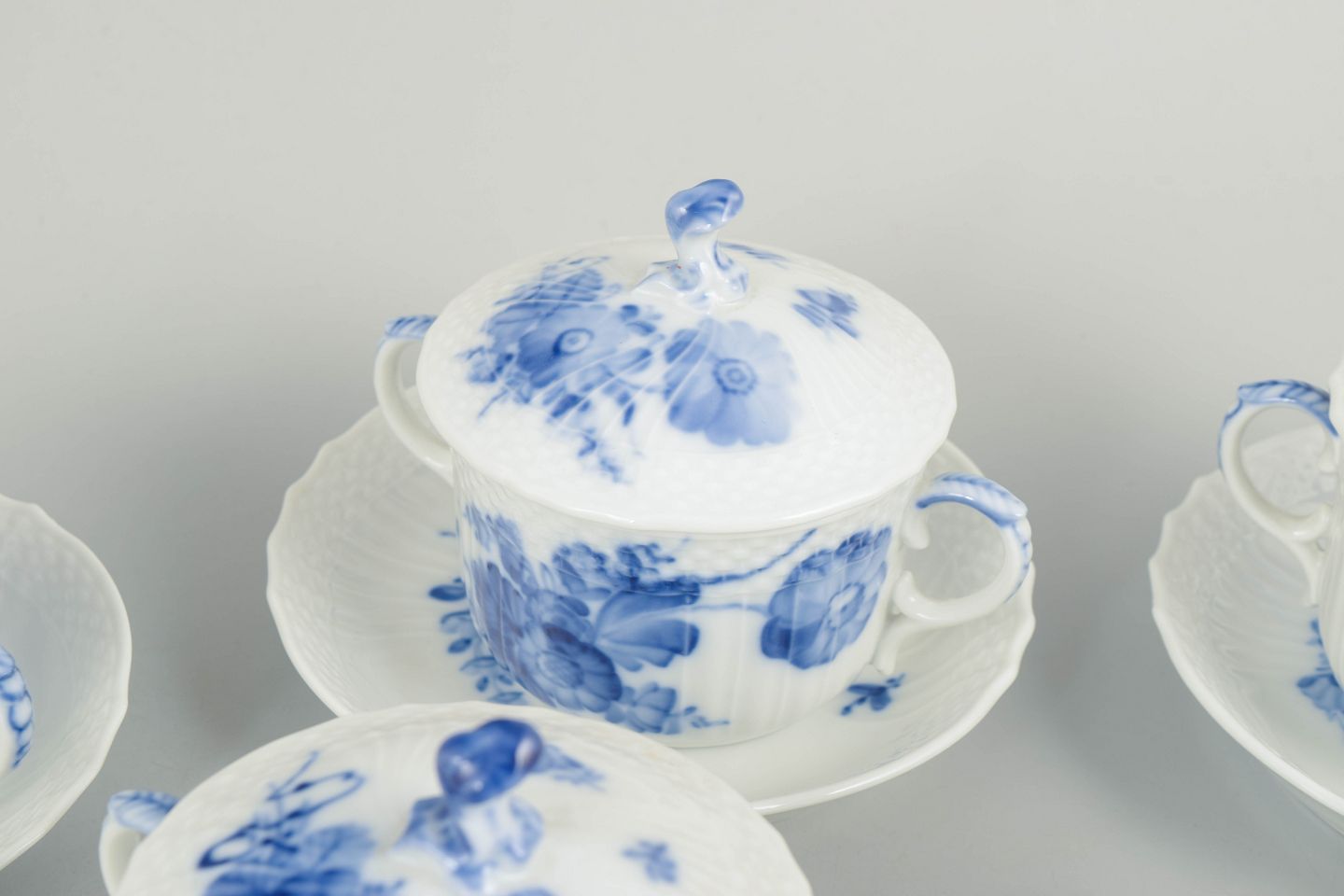 Sjældent sæt af bouillonkopper med låg i porcelæn, dekoreret i det klassiske håndmalede Blå Blomst Svejfet mønster. Model 10/1552, første sortering, dateret 1962.
