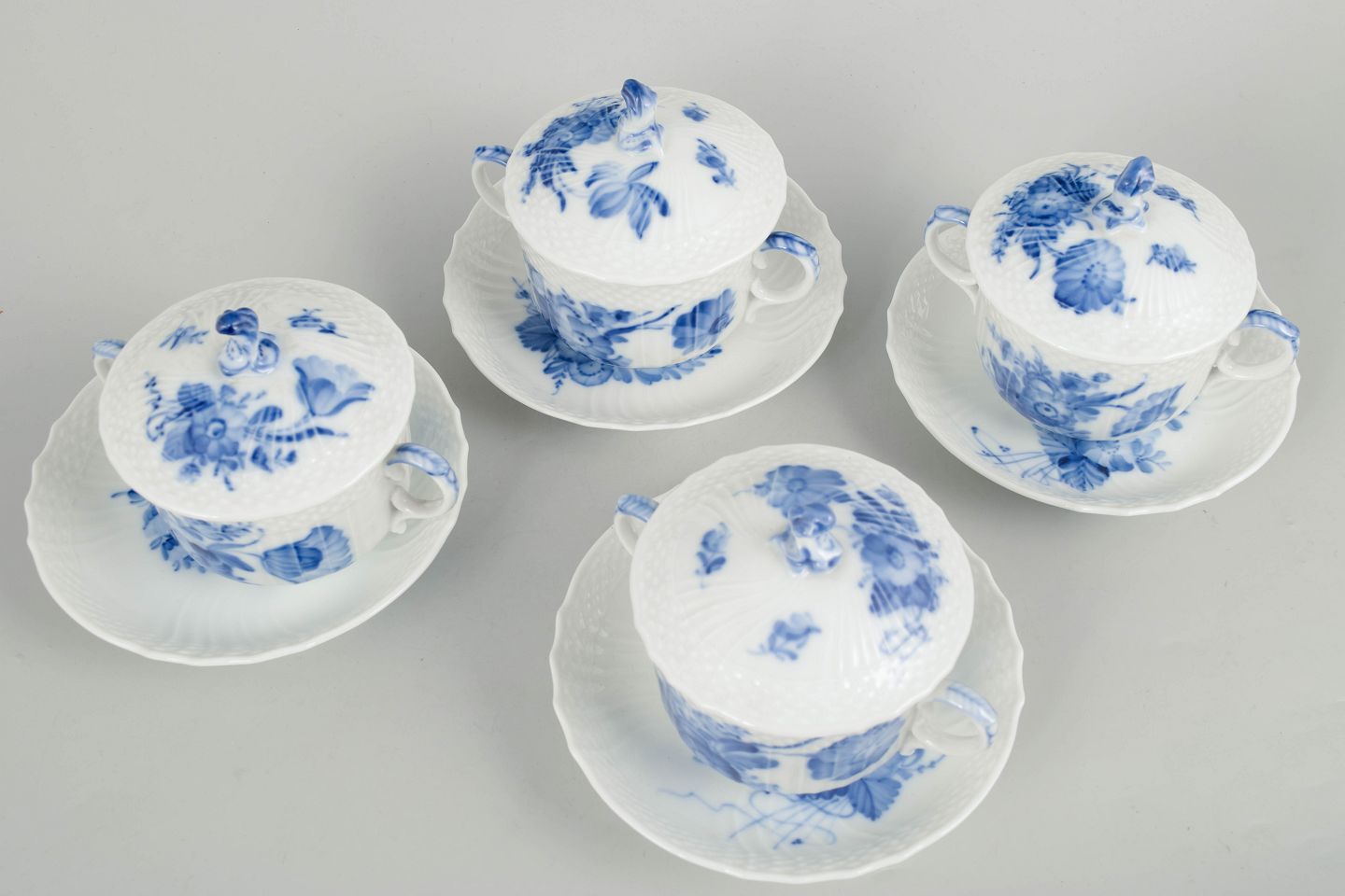 Royal Copenhagen Blå Blomst Svejfet, sæt af fire bouillonkopper med underkopper.
