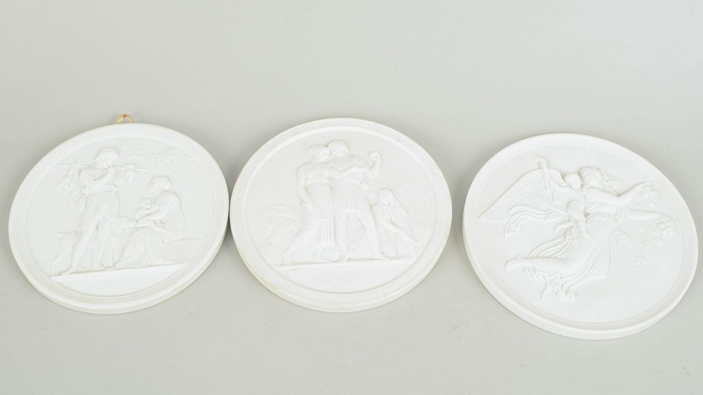 Royal Copenhagen, sæt af tre biscuit vægrelieffer efter Thorvaldsen.
