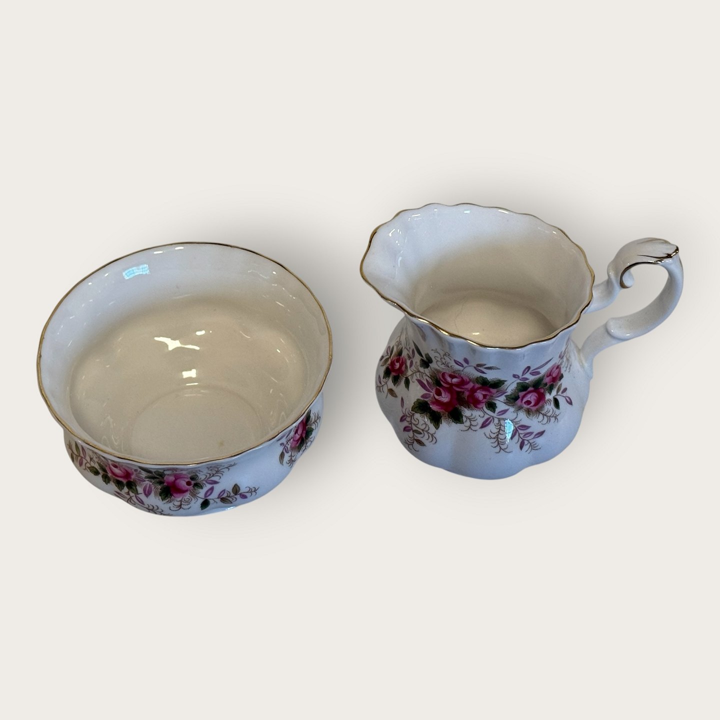 | Royal Albert, Bone China, Lavender Rose, Sukker og flødesæt, sukkerskål højde 5,5cm, diameter 9,5cm, flødekande ca. hxbxl 9x10x7cm *Perfekt stand*
