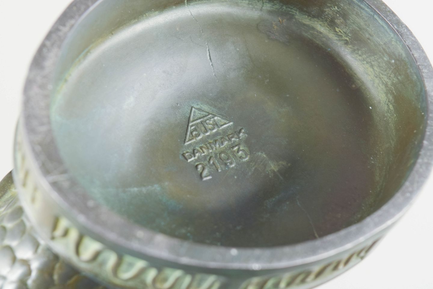 Skulpturel fiskefigur i diskometal udført i et markant og dekorativt art deco formsprog. Model 2193.