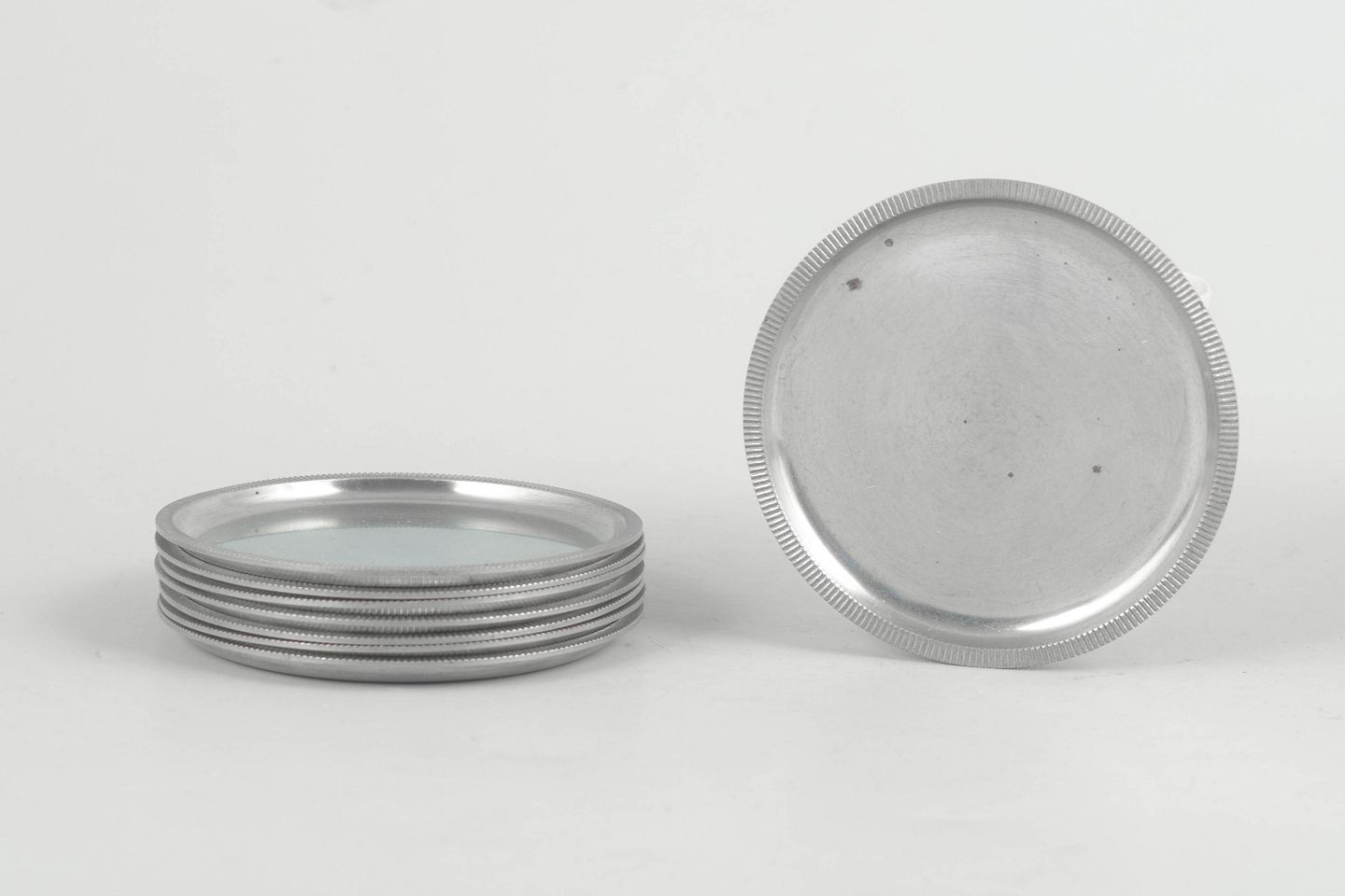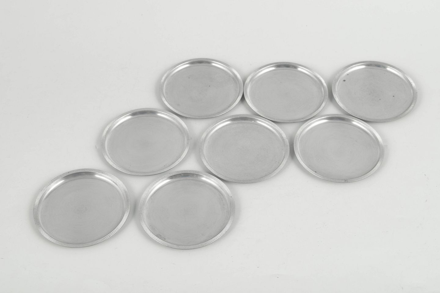 Set of eight coasters in pewter with a fluted rim and a simple art deco design. Model 2634.