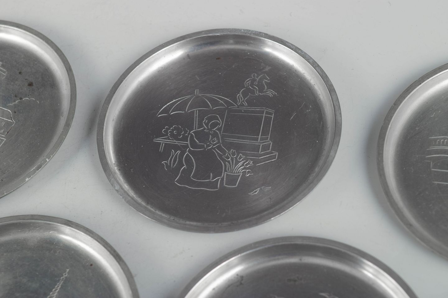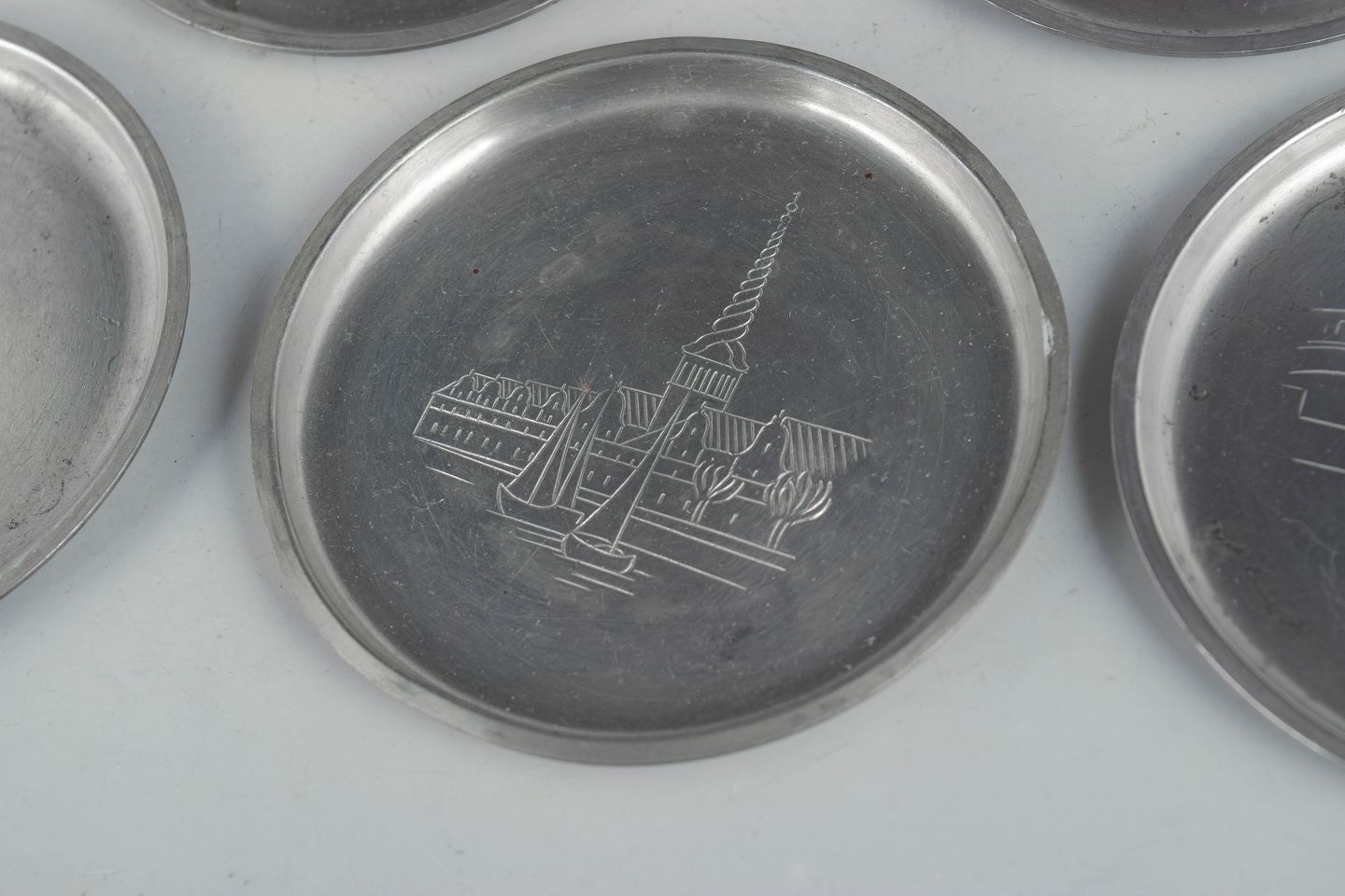 Sæt af seks flaskeunderlag i tin med indgraverede københavnermotiver i et dekorativt art deco formsprog. Model 2387.
