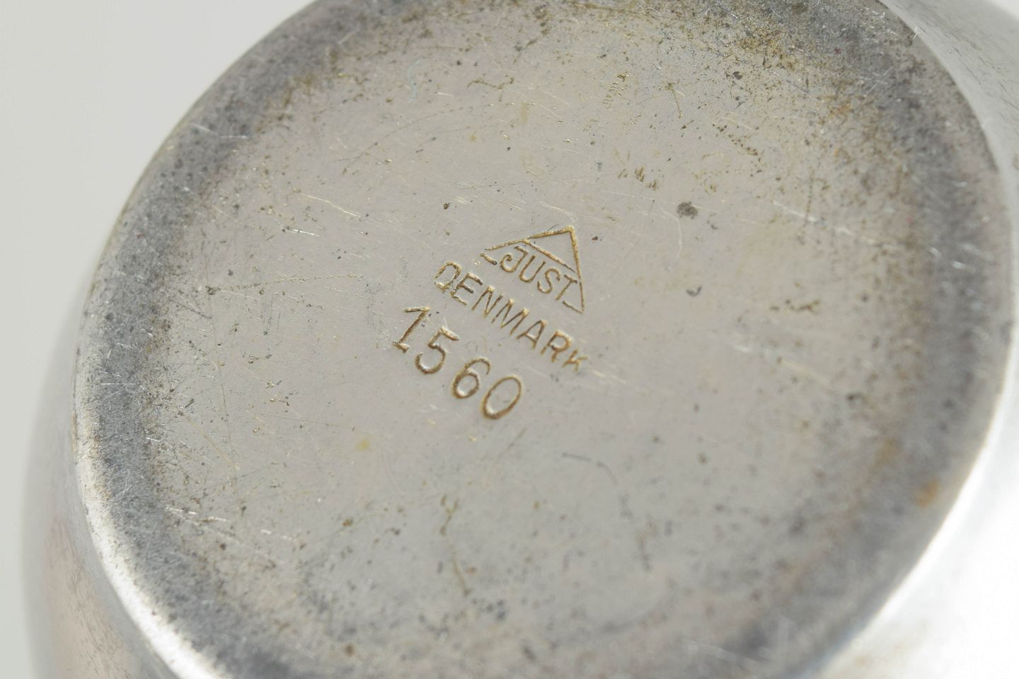 Kaffesæt i tin udført i art deco stil, bestående af kaffekande med flettet hank, flødekande og sukkerskål med låg. Kaffekande model 1303. Flødekande model 1560. Sukkerskål model 1560B.