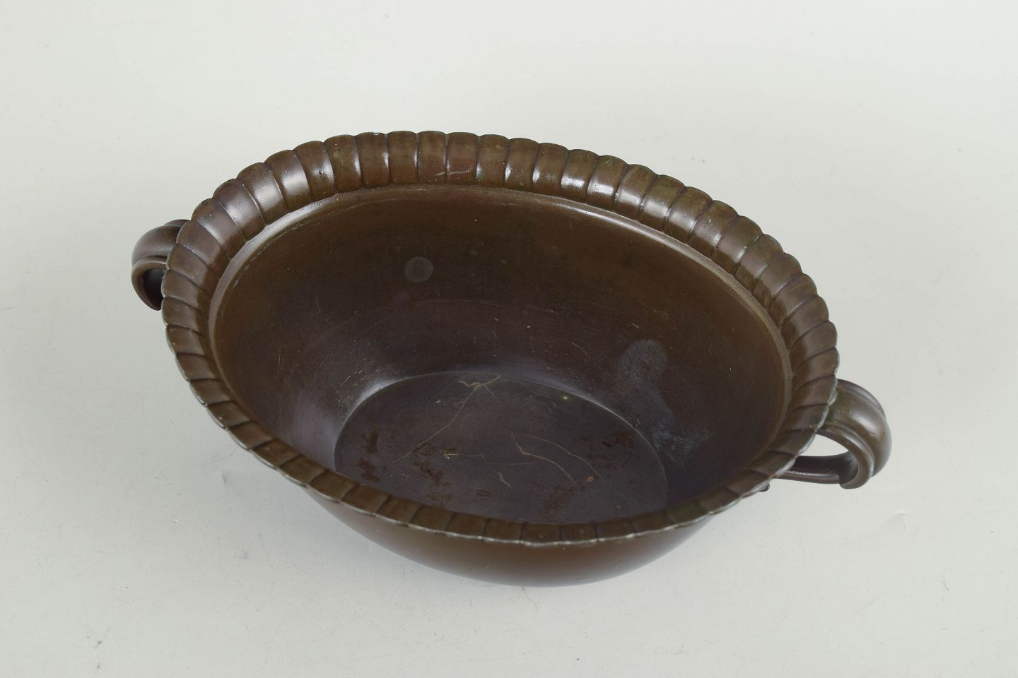 Bowl in disko metal with two curved handles and a fluted rim, executed in a distinctive art deco design. Model 1819A.