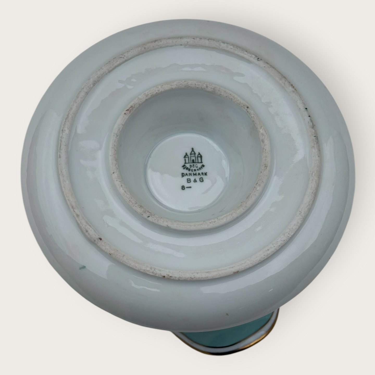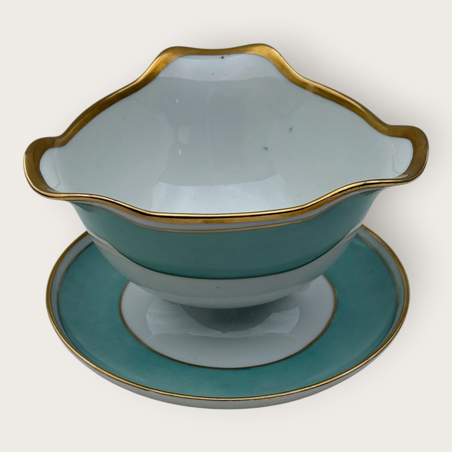 Bing & Grøndahl, Form 643 med bred turkis dekoration og guldkant, Sovseskål, 10,5cm høj, bredde 17cm, 2. sortering, *Et par små mærker under glasuren (se foto) ellers pæn stand*
