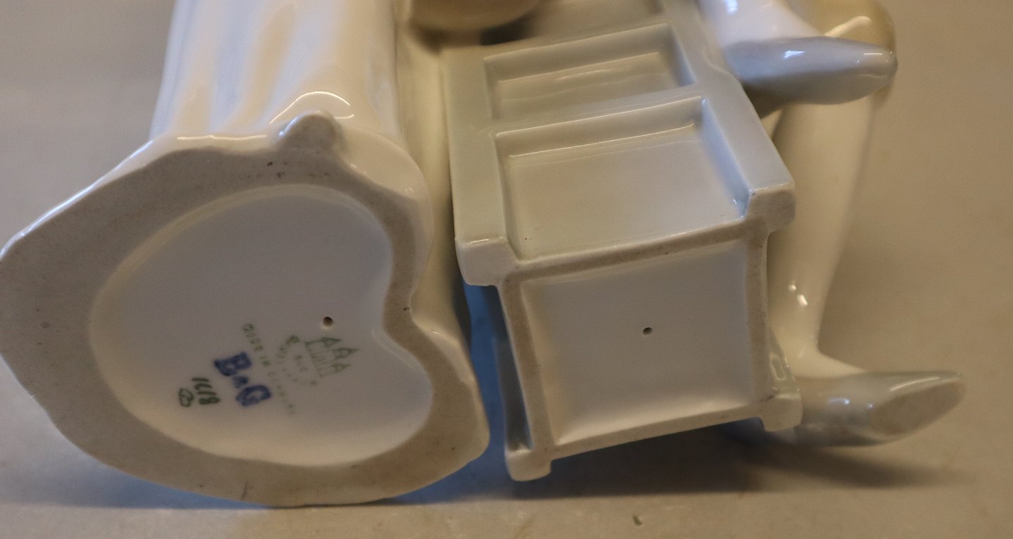 B&G 1618 Siddende mand med mandolin og stående kvinde 28.5 cm Bing & Grøndahl I fin og hel stand. Strengeinstrumentet kan også være en lut. Stilen på figuren og perioden peger på Ingeborg Plockross Irminger som designer