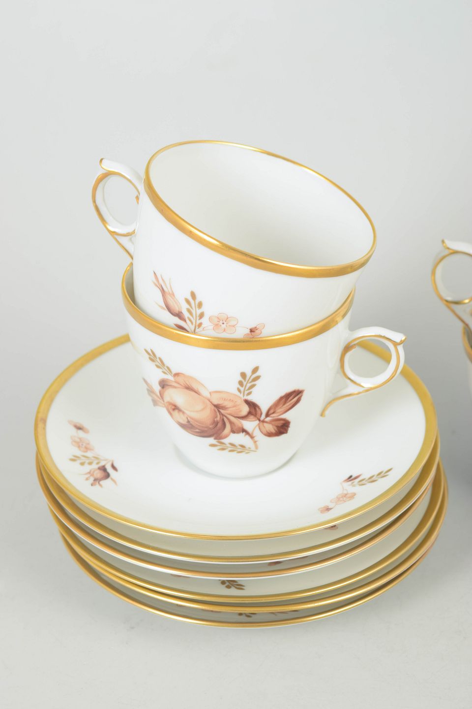 Elegant stel i hvidt porcelæn dekoreret med brun blomsterdekoration og guldkant. Model 688/9069. Første sortering.