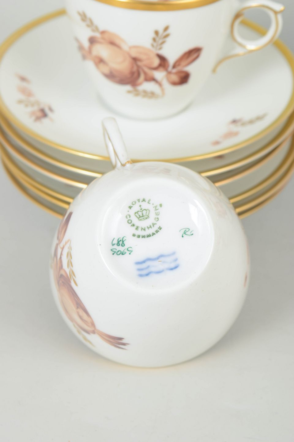 Royal Copenhagen brun rose, sæt af seks kaffekopper med underkopper.