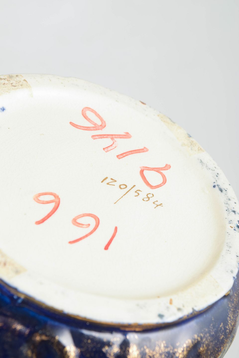 Høj, balusterformet vase i fajance med dyb koboltblå glasur, rigt dekoreret med forgyldte detaljer og centralt motiv med figurgruppe i klassisk stil.