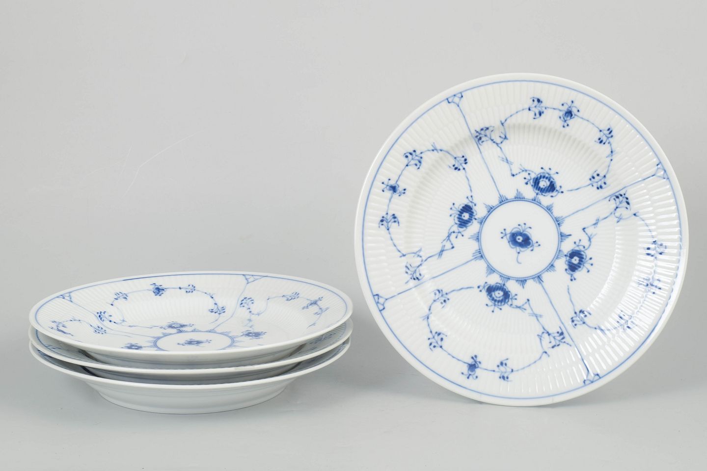 Royal Copenhagen Musselmalet Riflet, sæt af fire middagstallerkener.