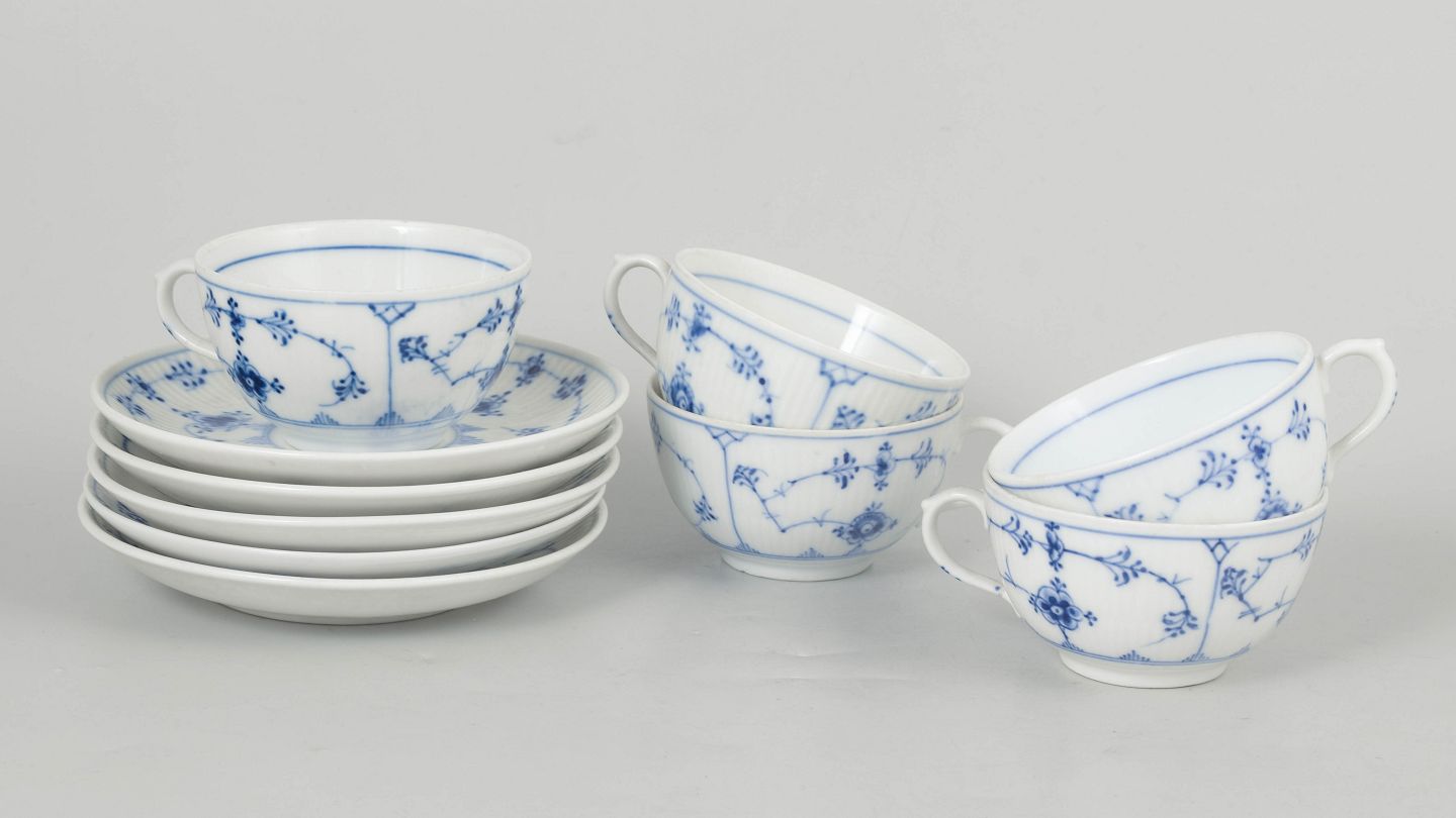 Royal Copenhagen Musselmalet Riflet, sæt af fem kaffekopper med underkopper.